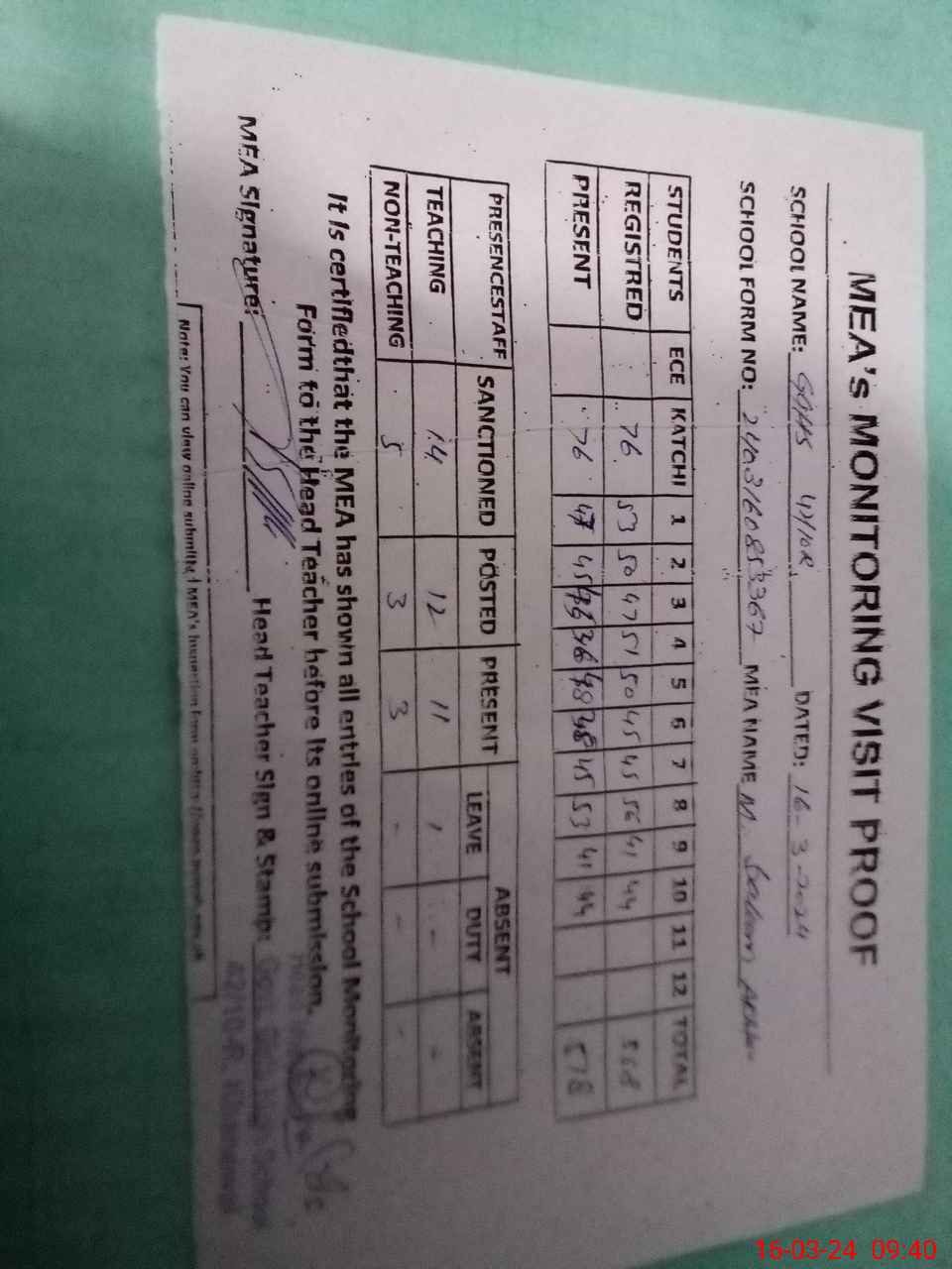 | Attendance Register | Head Teacher | MEA with School | Visit Proof |