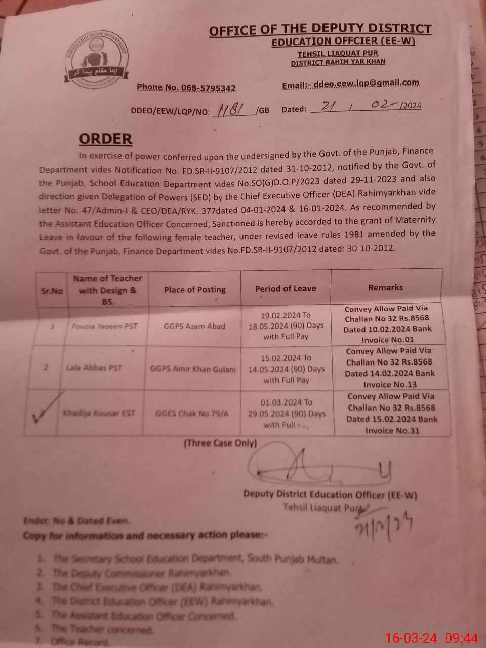 | District: RAHIMYAR KHAN | Tehsil: LIAQATPUR | Markaz: 68/A - FEMALE | Level: Middle | |