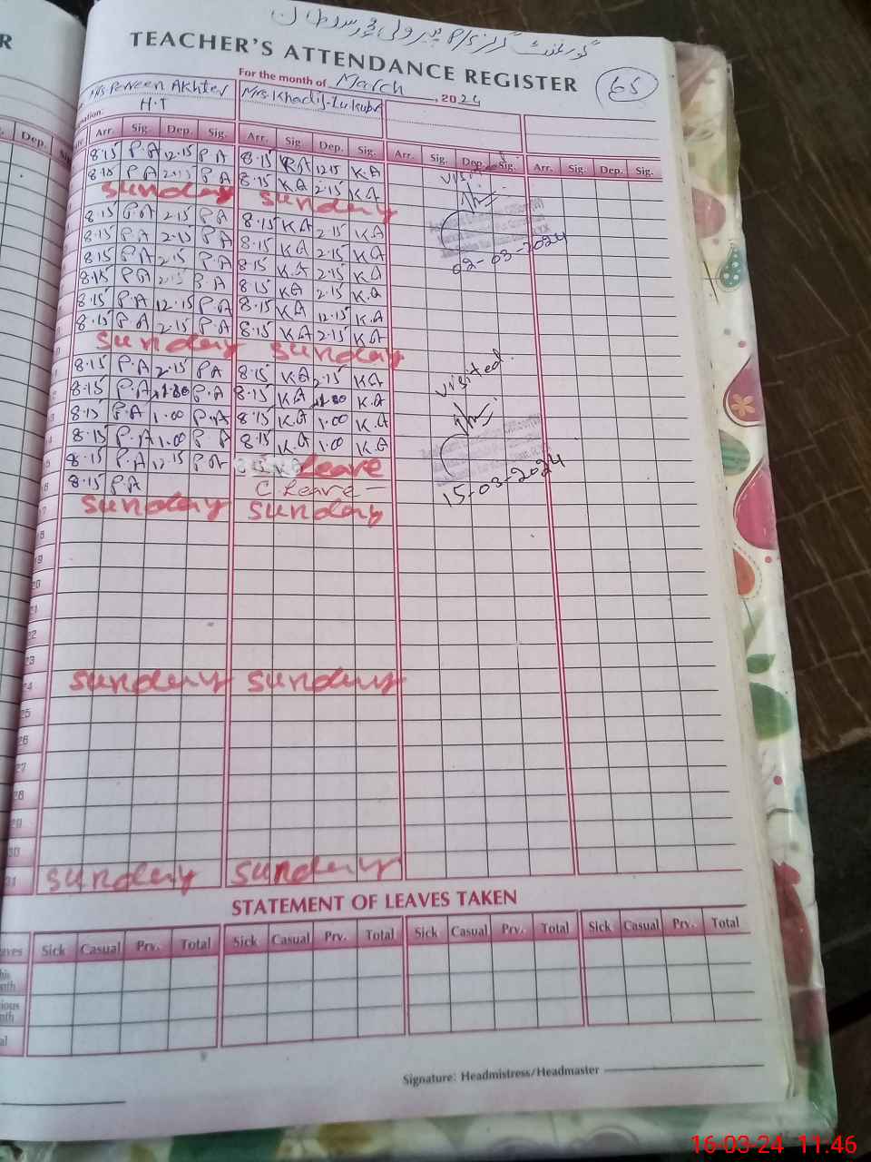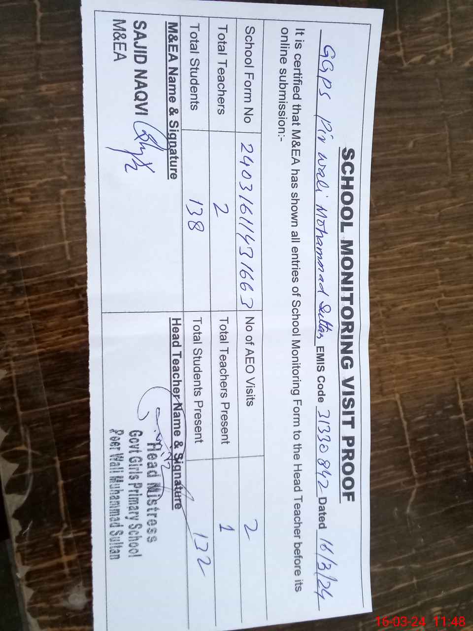 | Attendance Register | Head Teacher | MEA with School | Visit Proof |