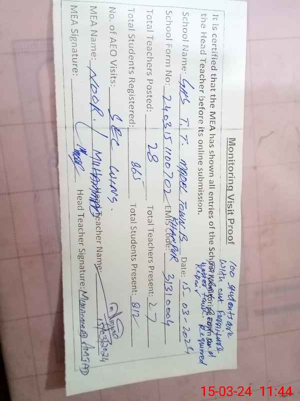 | Certified that this School was Inspected by the Undersigned MEA/DMO Today and the Information Stated Above is as Per Record. | |||||