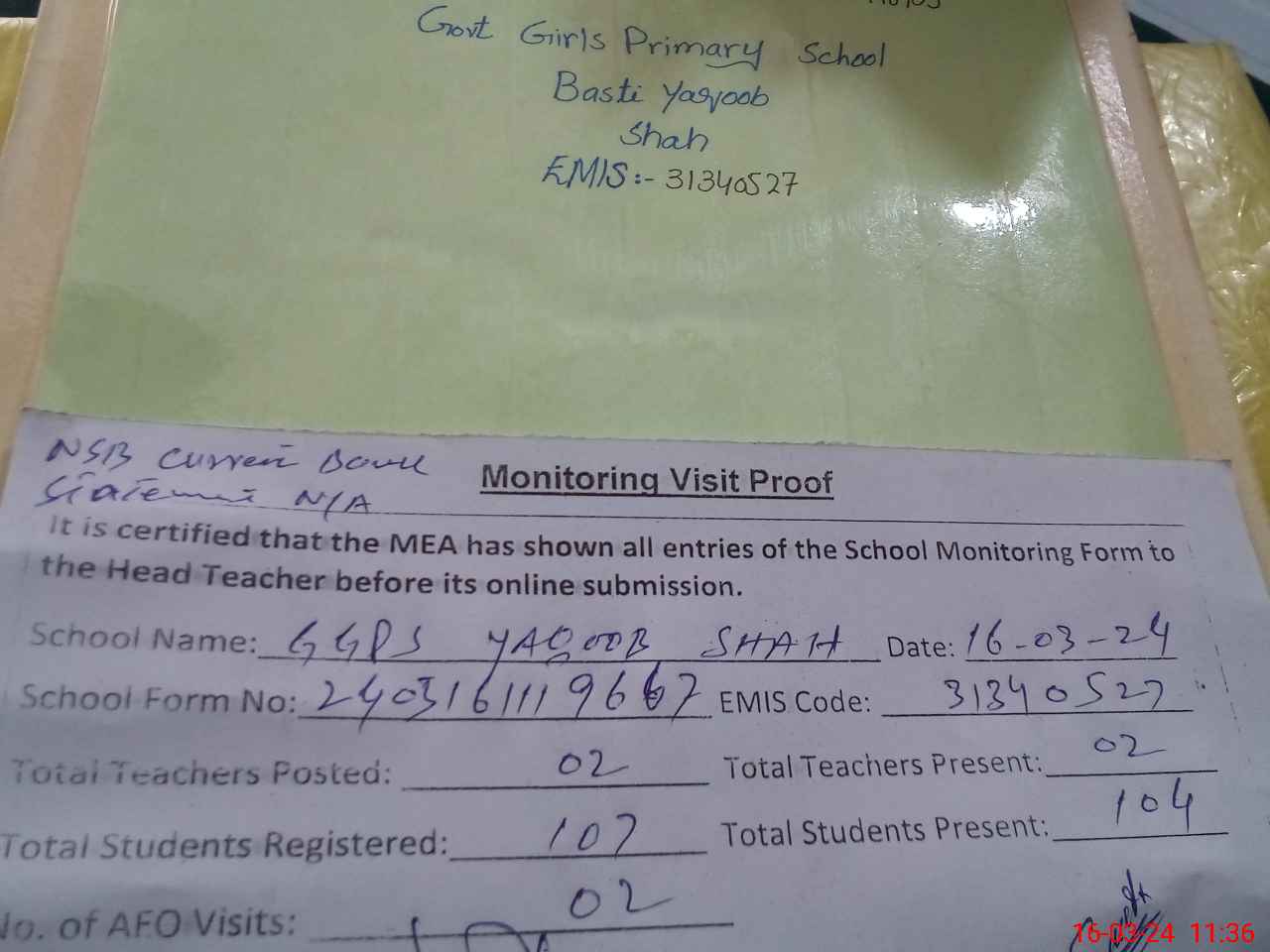 | Attendance Register | Head Teacher | MEA with School | Visit Proof |