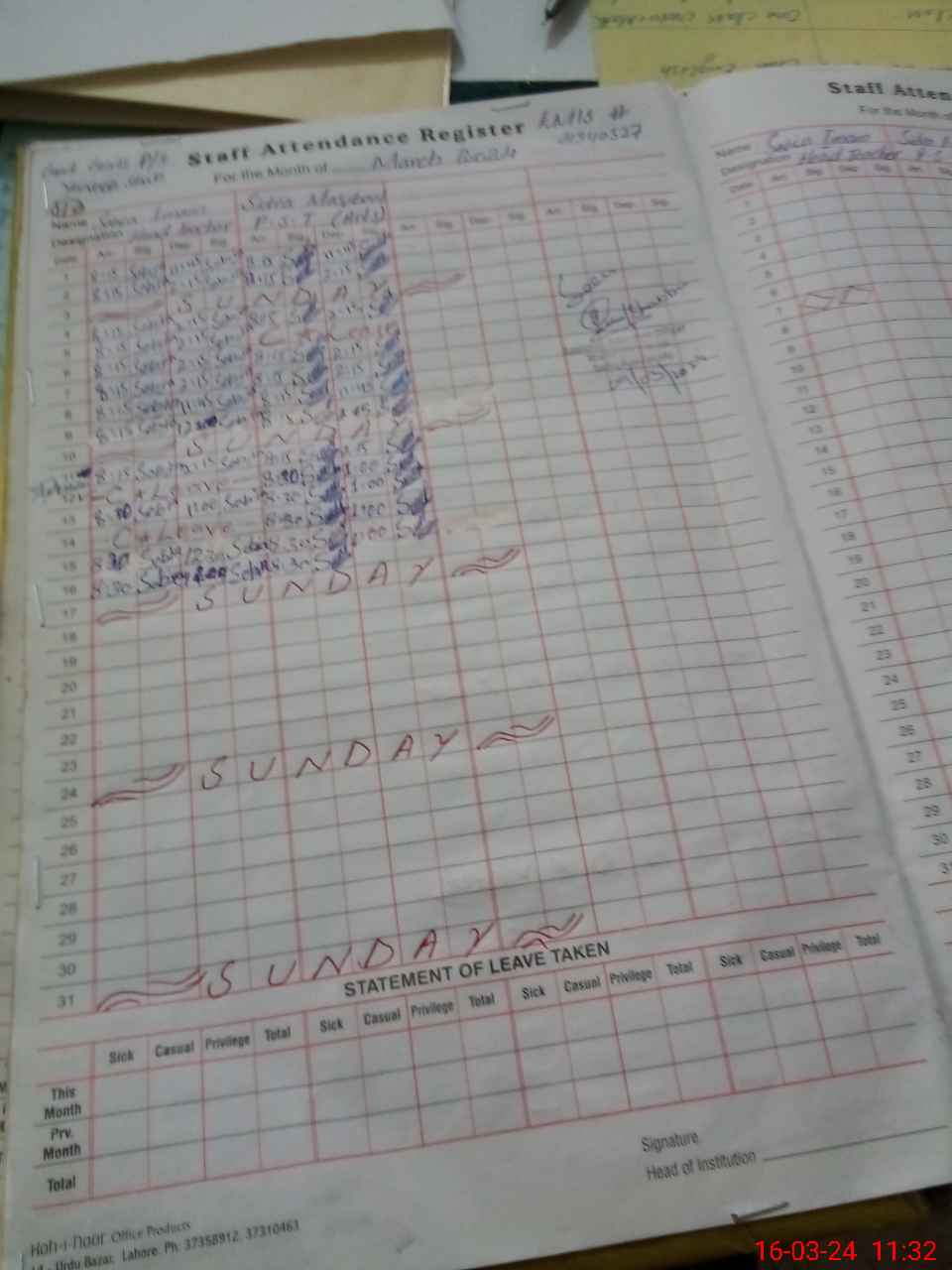 | Leave | Duty | Absent | Maternity | Medical | Ex- Pak |