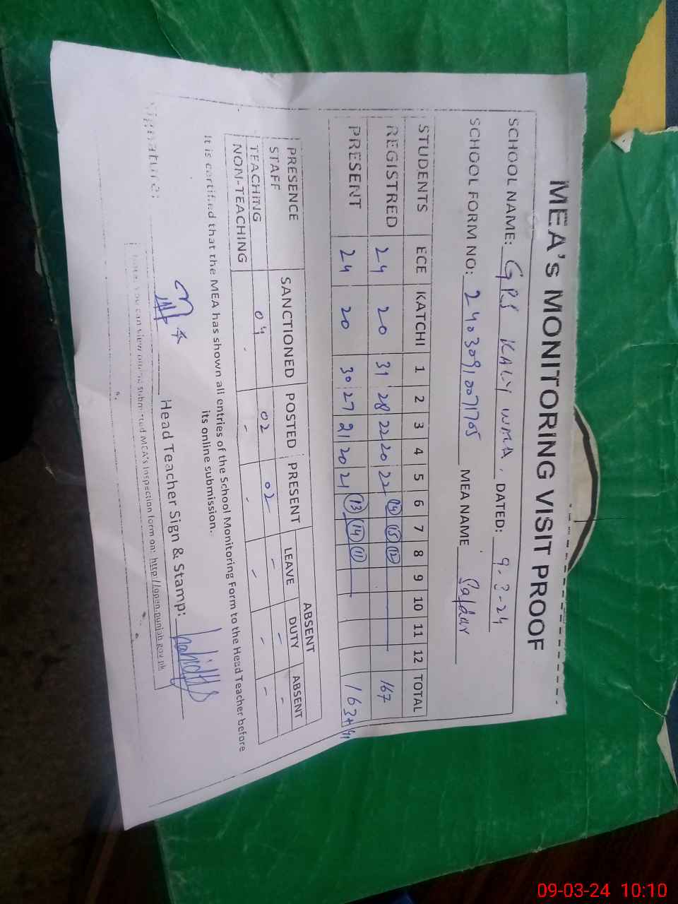 | Attendance Register | Head Teacher | MEA with School | Visit Proof |