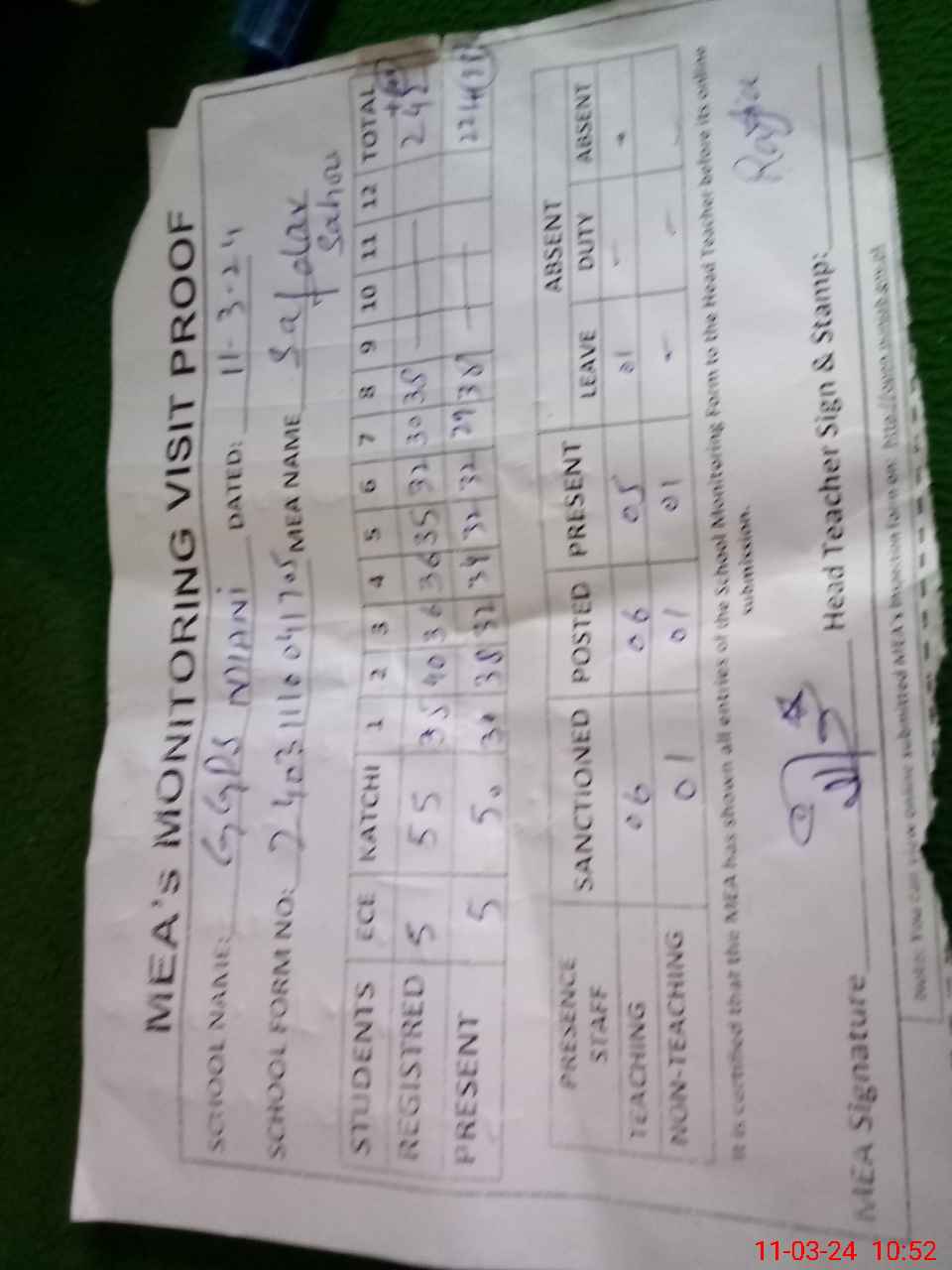 | Attendance Register | Head Teacher | MEA with School | Visit Proof |