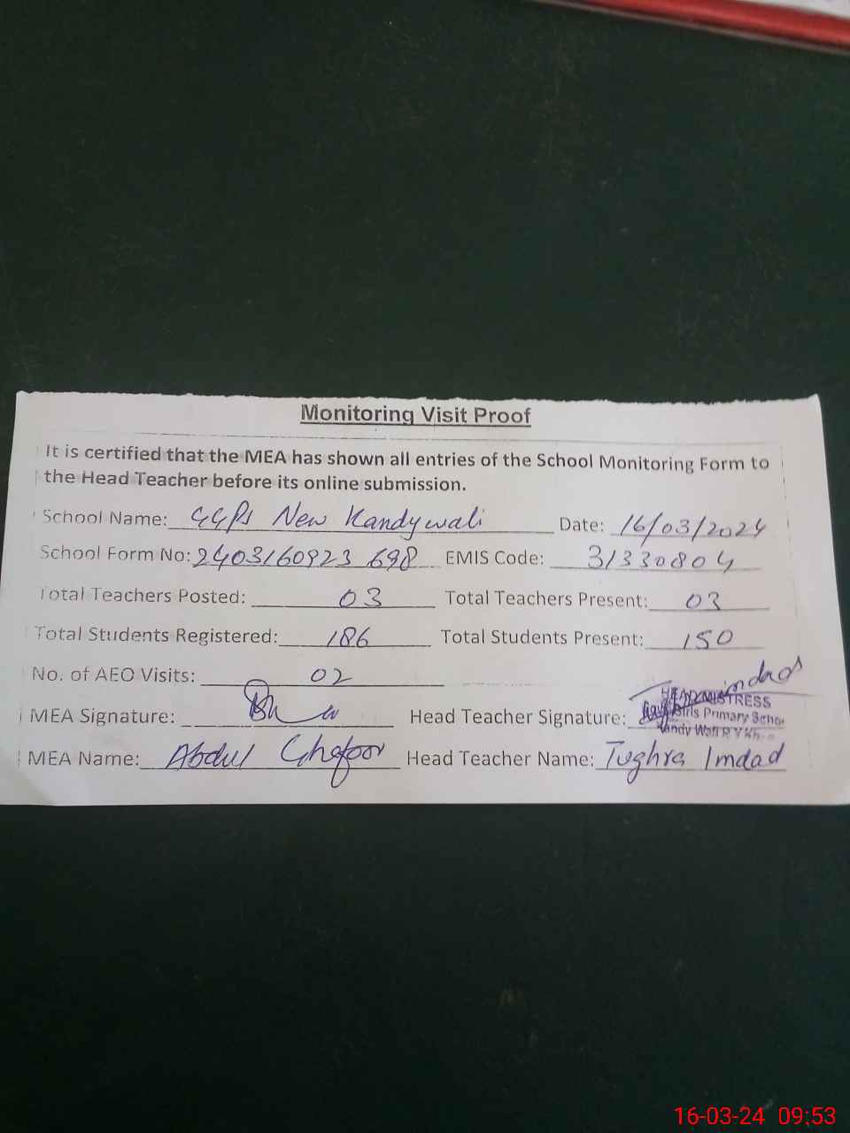 | Attendance Register | Head Teacher | MEA with School | Visit Proof |
