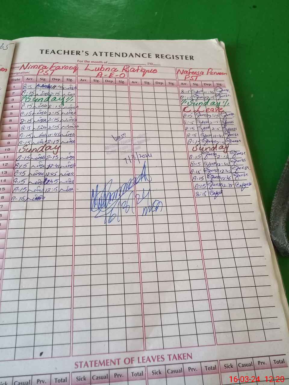 | CNIC | Full Name | Designation | R/C | Absence During Last Calender Month |