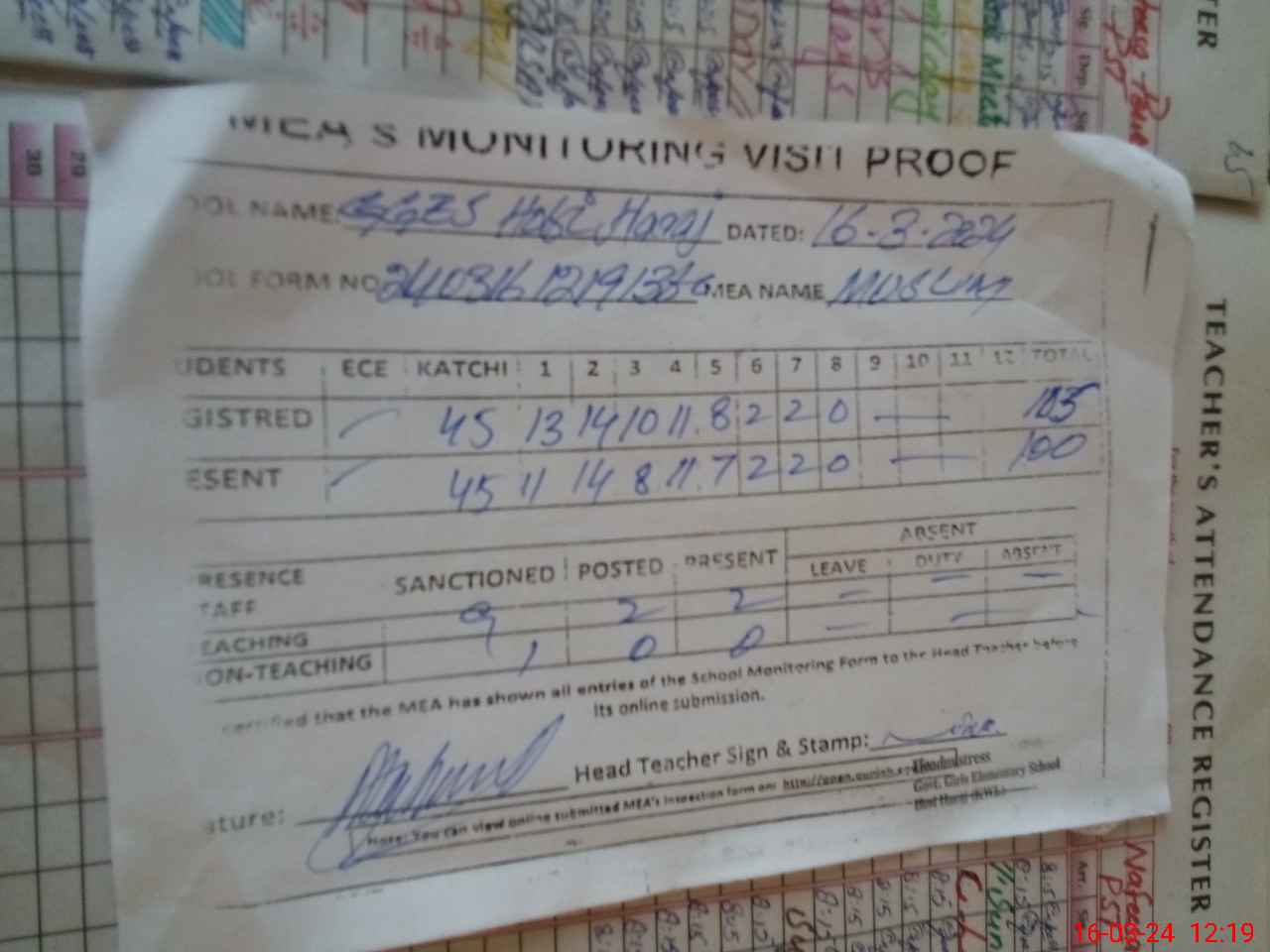 | Attendance Register | Head Teacher | MEA with School | Visit Proof |