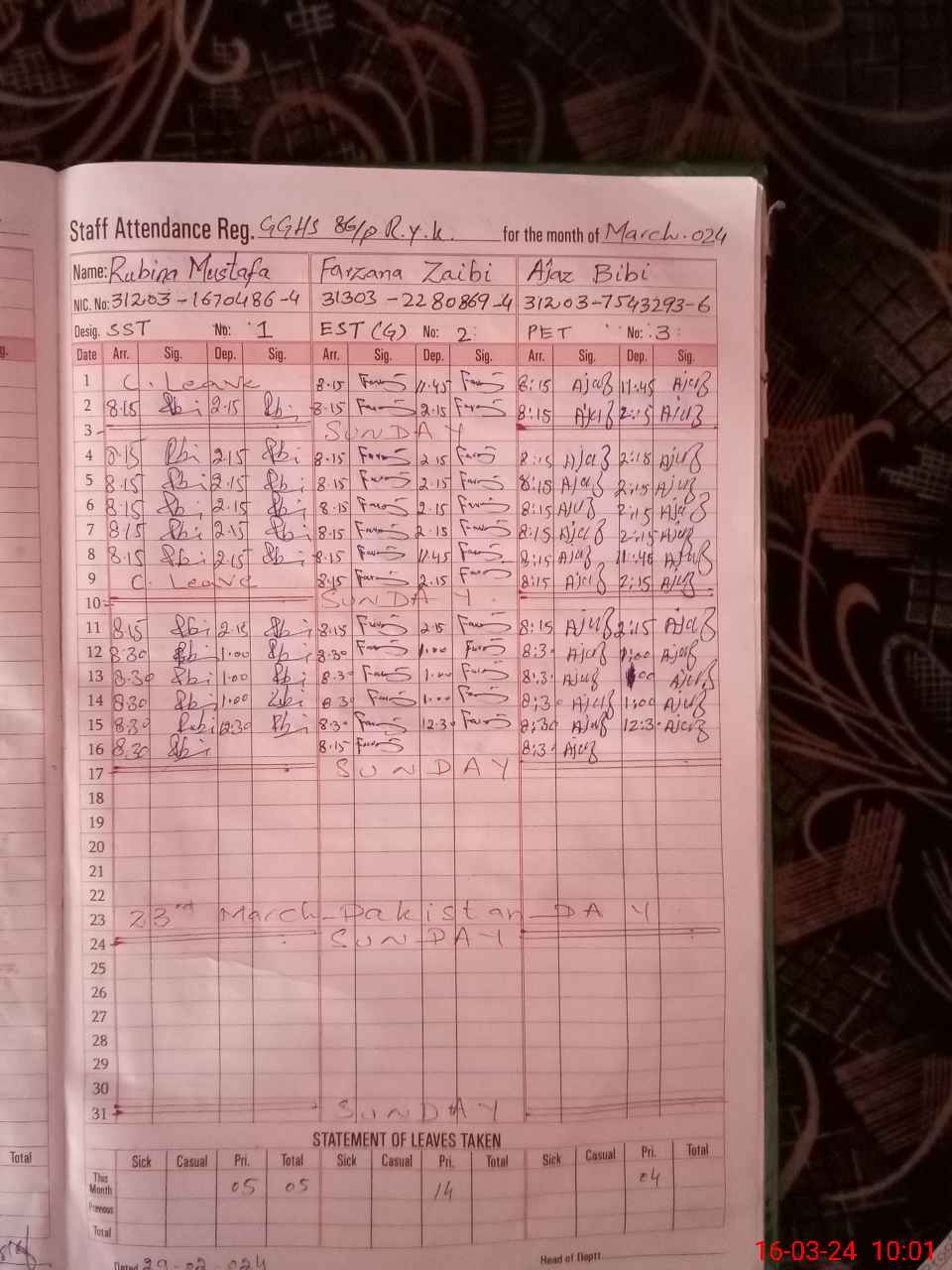 | CNIC | Full Name | Designation | R/C | Absence During Last Calender Month |