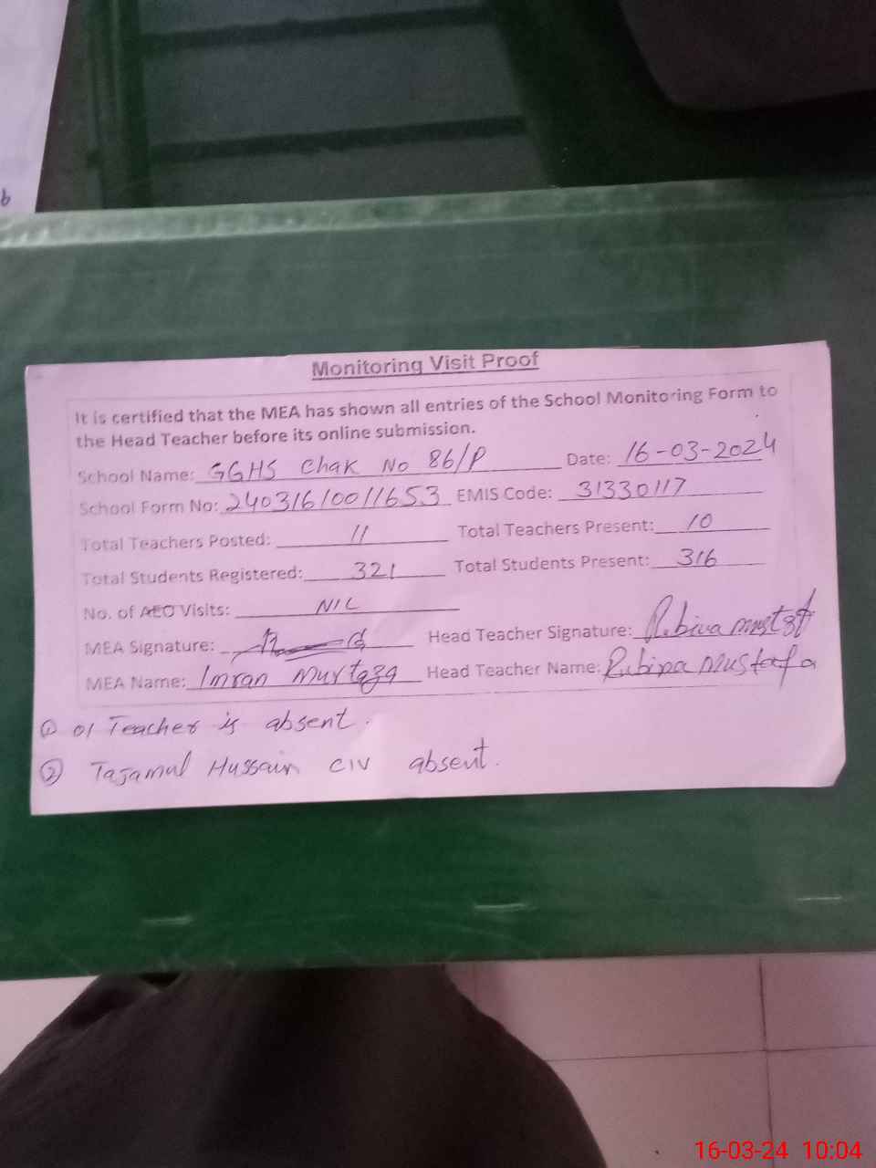 | Attendance Register | Head Teacher | MEA with School | Visit Proof |