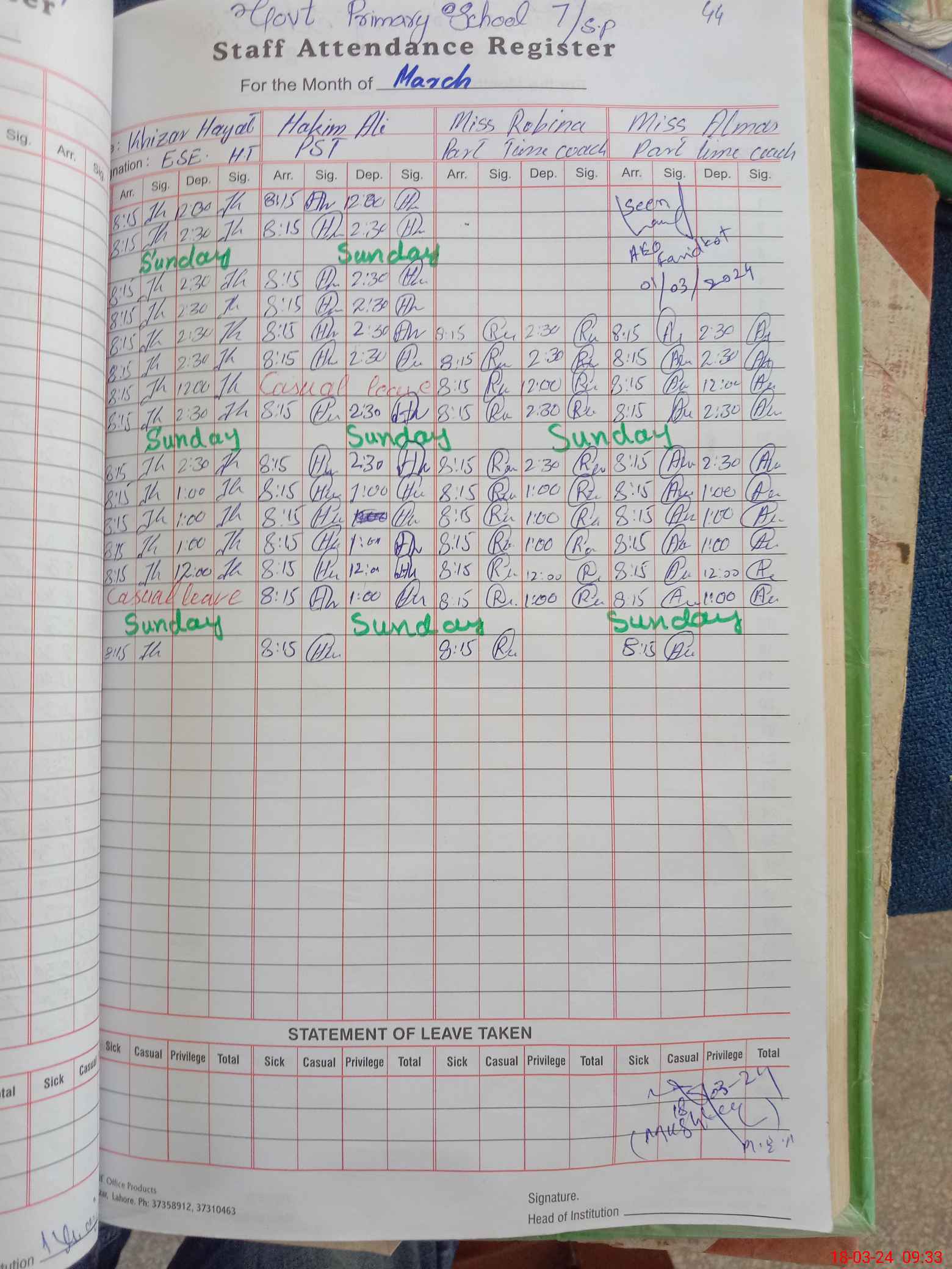 | Leave | Duty | Absent | Maternity | Medical | Ex- Pak |