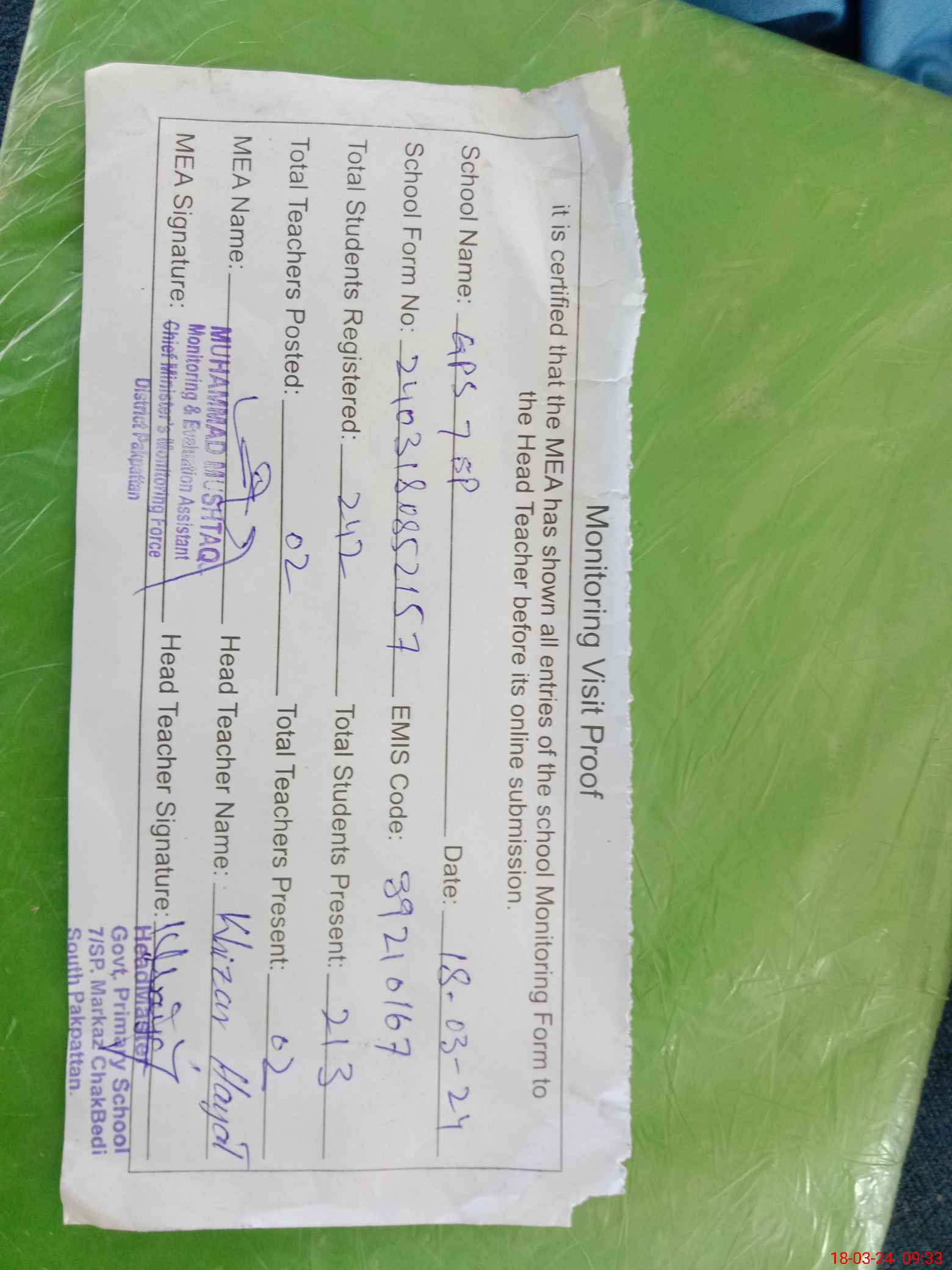| EMIS Code: 39210167 | Name of School: GPS 7 SP PO MOLVI WALA PAKPATTAN | |||