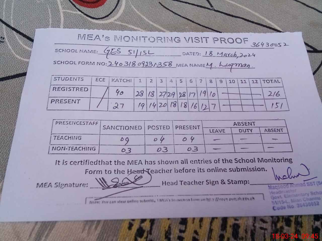 | Attendance Register | Head Teacher | MEA with School | Visit Proof |