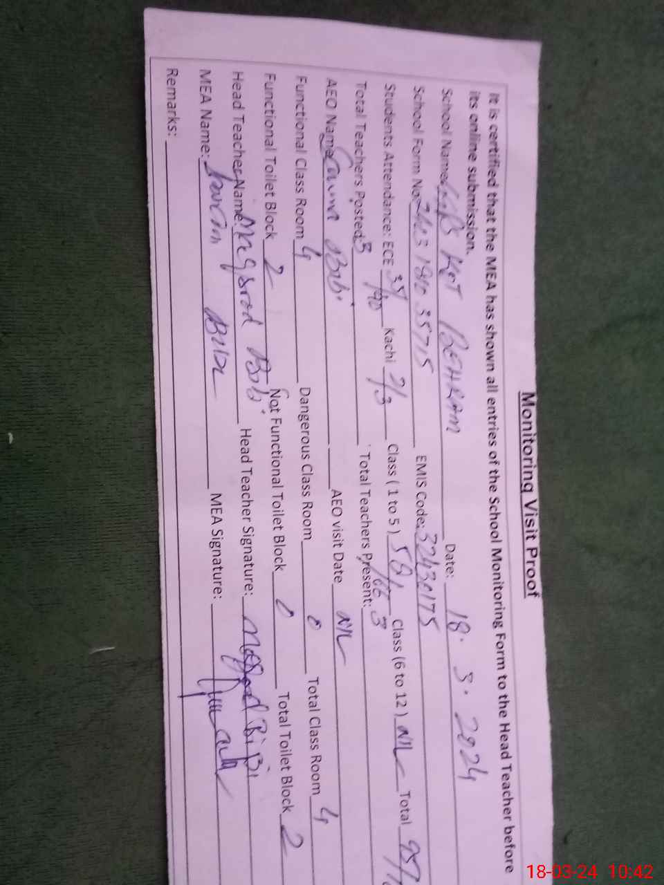 | Attendance Register | Head Teacher | MEA with School | Visit Proof |