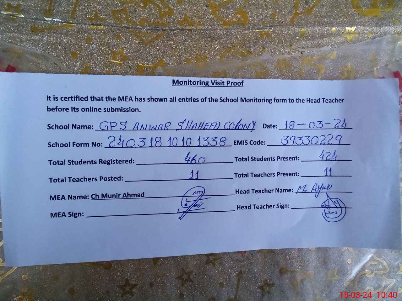 | EMIS Code: 39330229 | Name of School: GPS ANWAR SHAHEED COLONY | |||