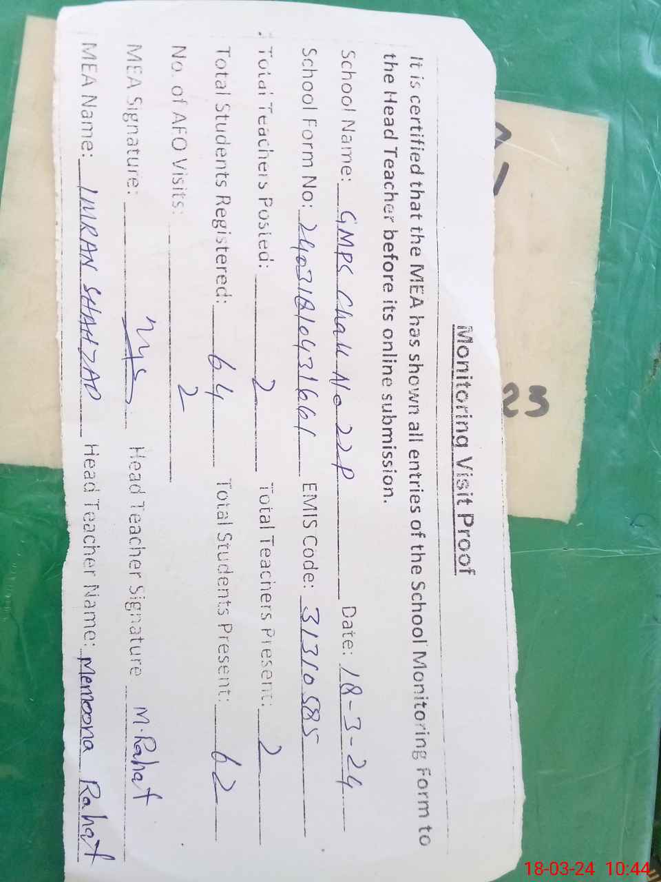 | EMIS Code: 31310585 | Name of School: GMPS CHAK 22/P | |||
