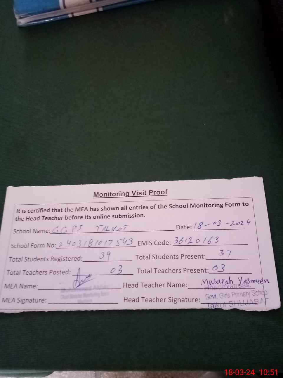 | EMIS Code: 36120163 | Name of School: GGPS TALKOT SHUJABAD | |||
