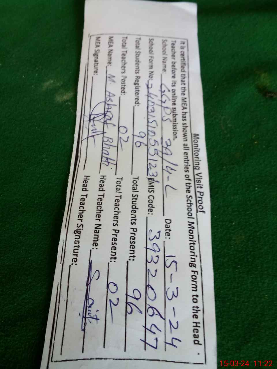 | Name: SH**** SH**** Designation: (School Headmaster's/Headmistress's) PST Phone/Cell Number: 03**** |