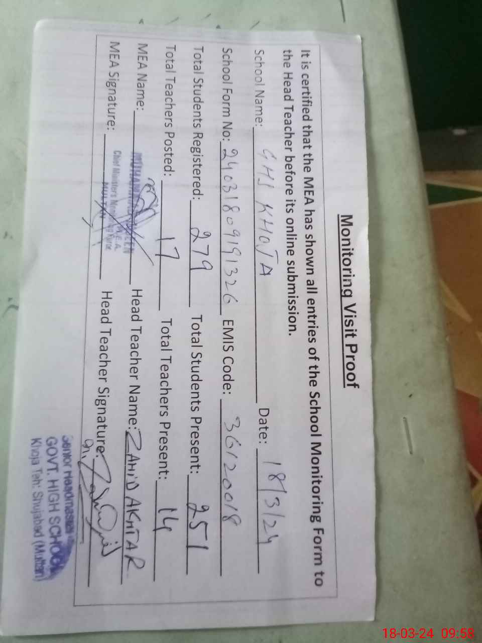 | EMIS Code: 36120018 | Name of School: GHS KHOJA P.O. KHOJA TEH. SHUJABAD DISTRICT MULTAN | |||