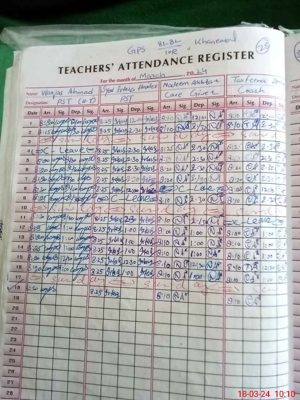| CNIC | Full Name | Designation | R/C | Absence During Last Calender Month |
