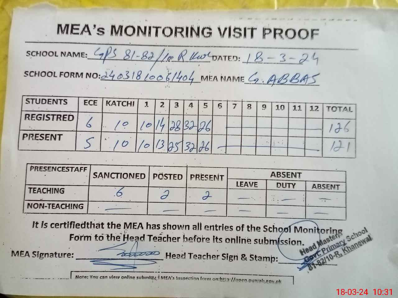 | Attendance Register | Head Teacher | MEA with School | Visit Proof |