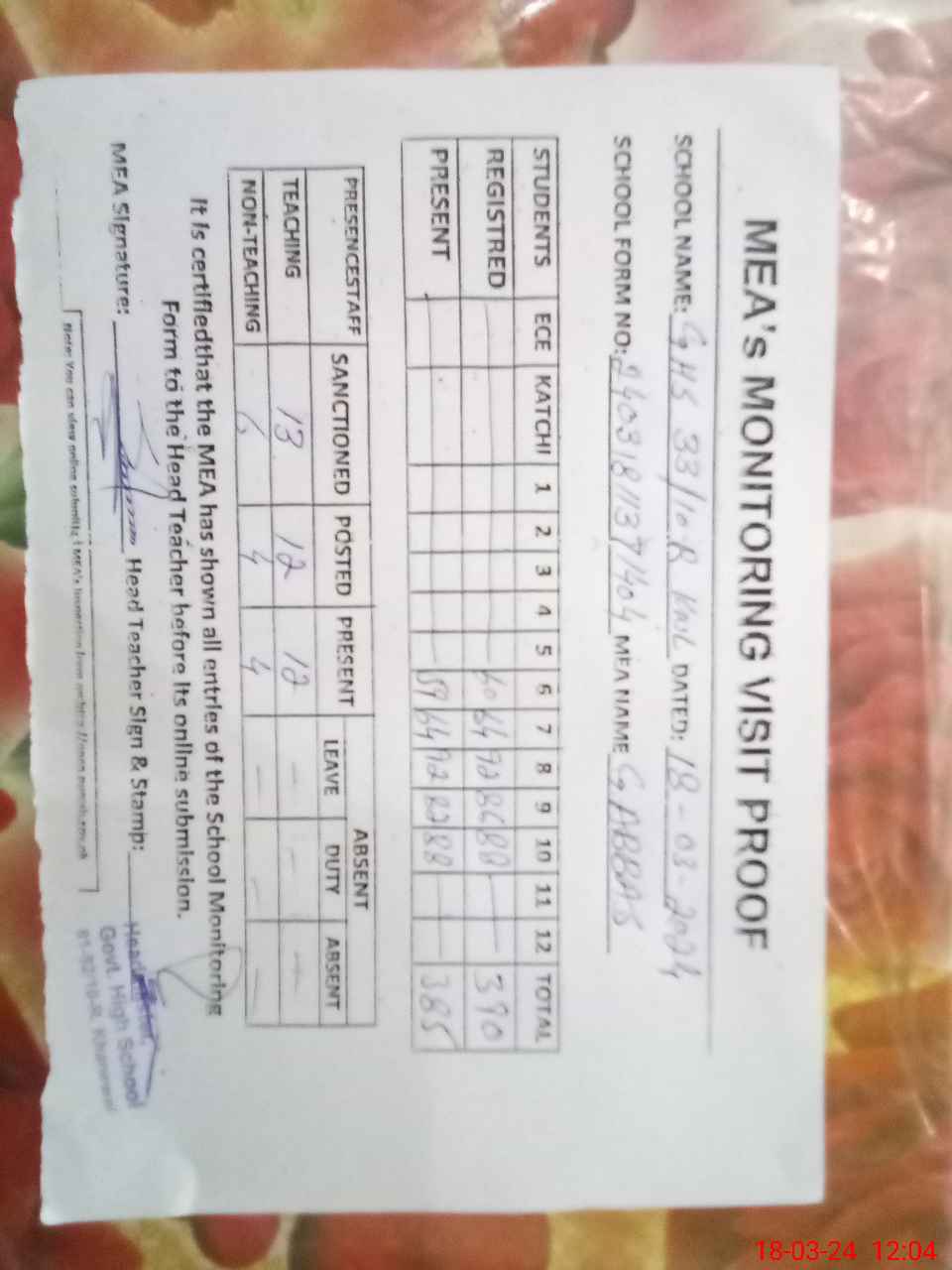 | Attendance Register | Head Teacher | MEA with School | Visit Proof |