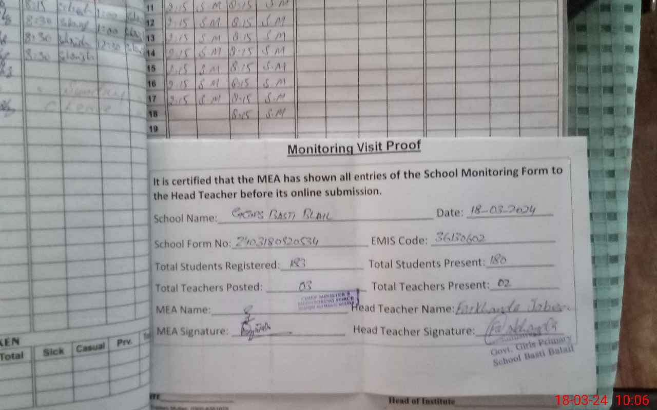 | Attendance Register | Head Teacher | MEA with School | Visit Proof |
