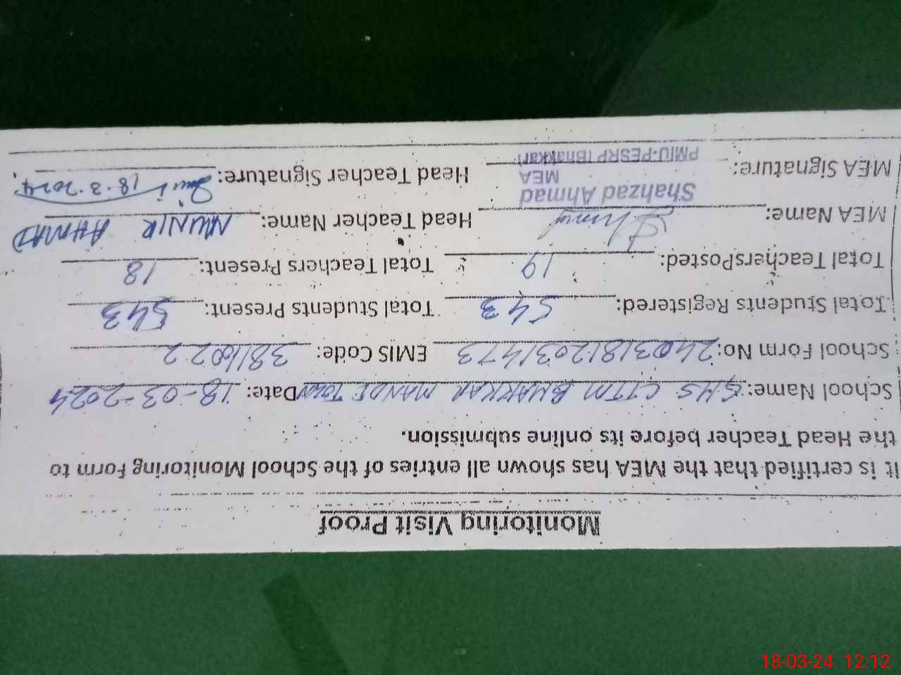 | Certified that this School was Inspected by the Undersigned MEA/DMO Today and the Information Stated Above is as Per Record. | |||||