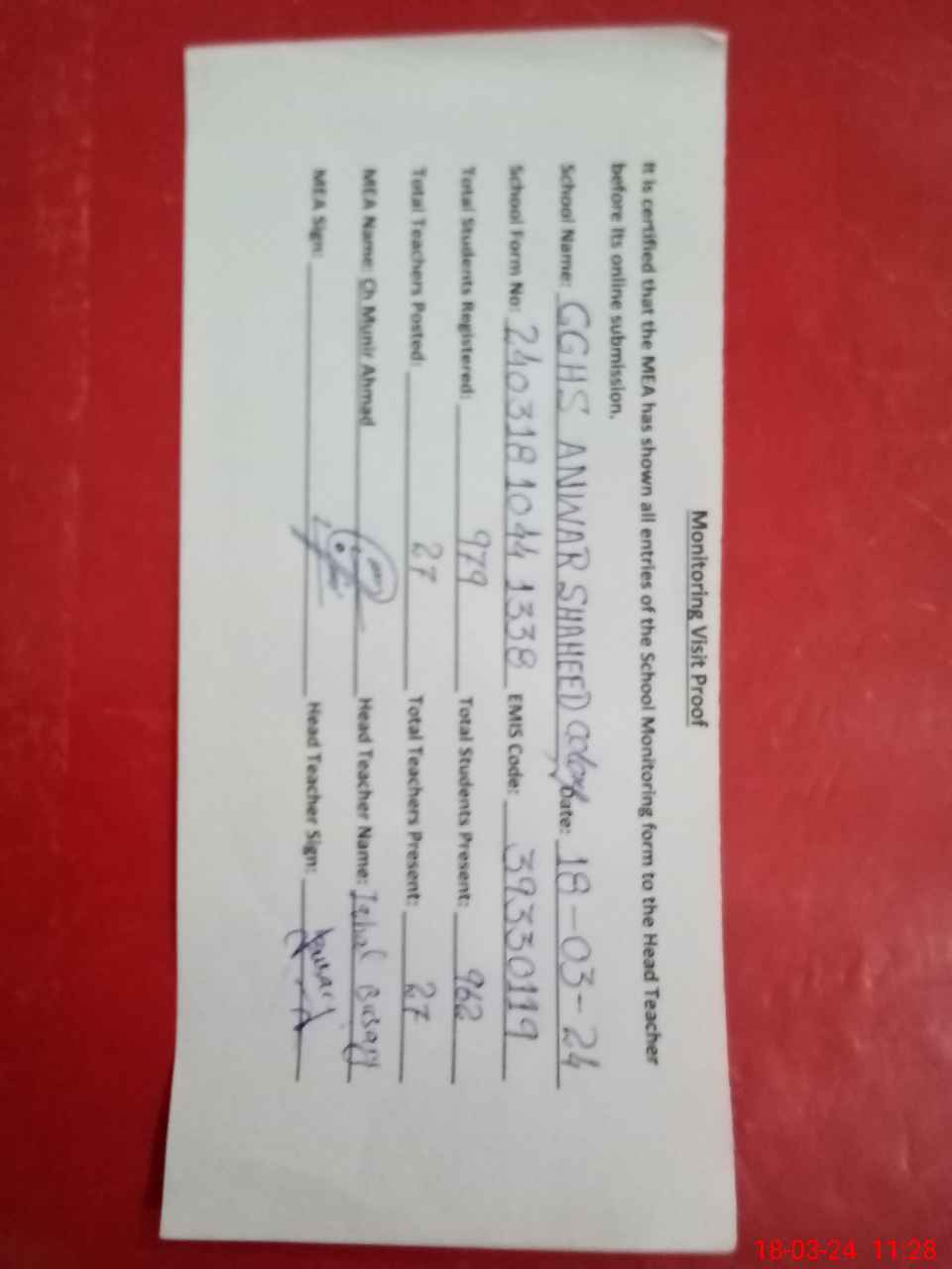| Attendance Register | Head Teacher | MEA with School | Visit Proof |