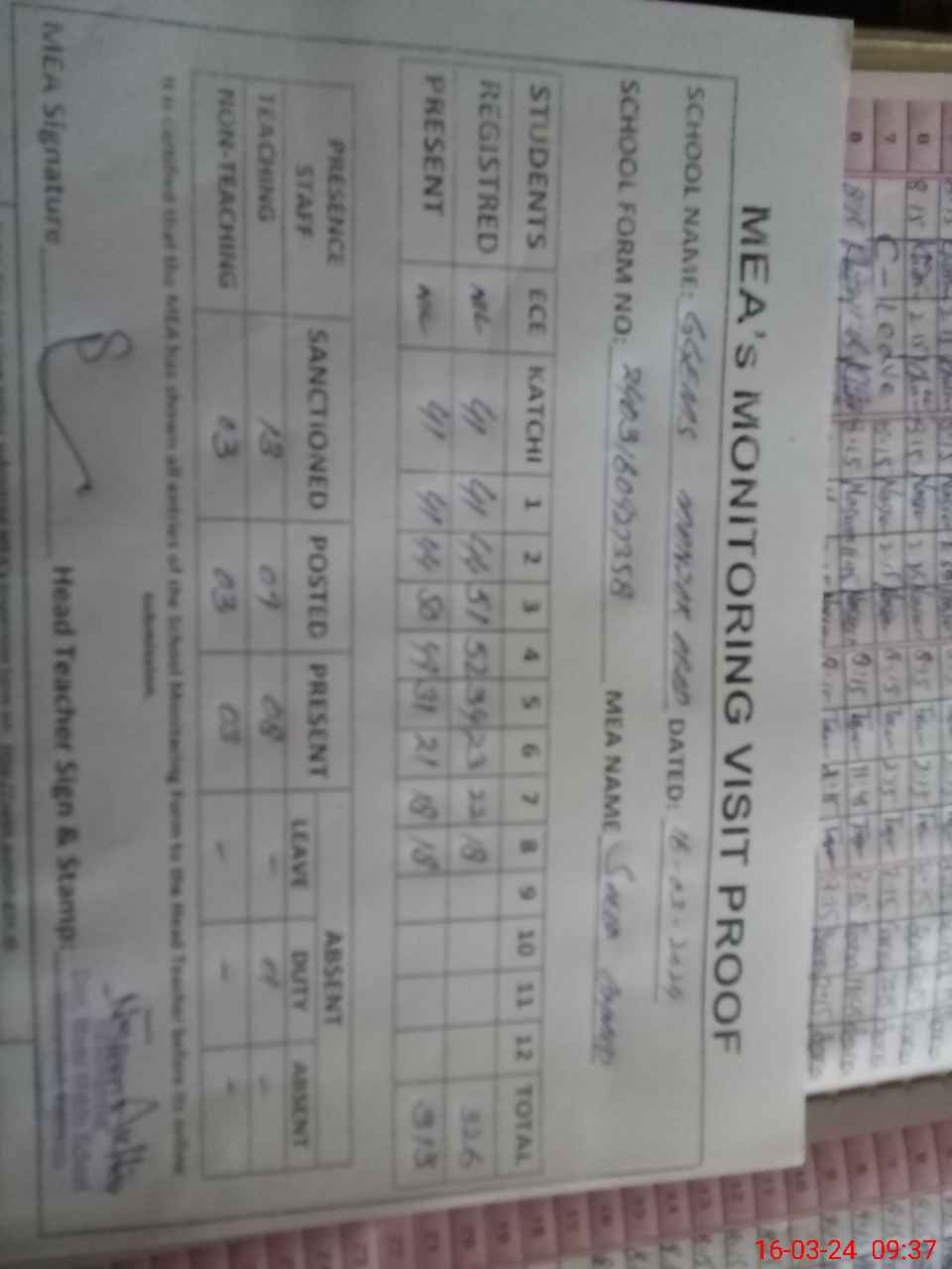 | Attendance Register | Head Teacher | MEA with School | Visit Proof |