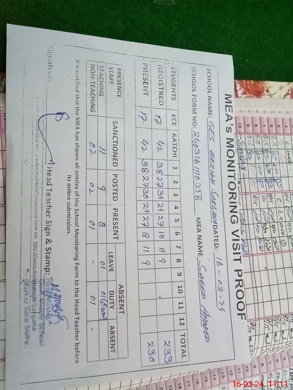 | Attendance Register | Head Teacher | MEA with School | Visit Proof |