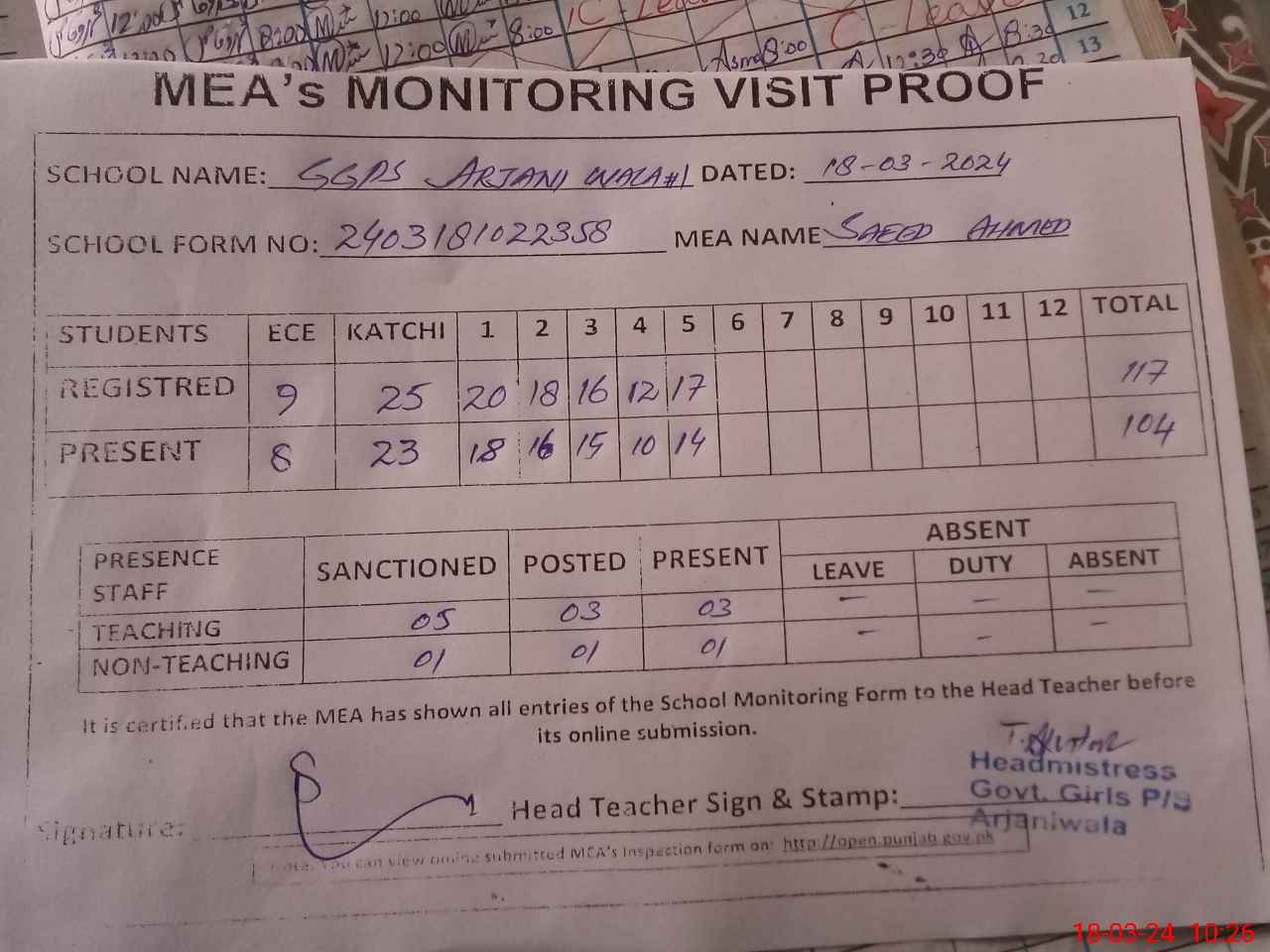 | Attendance Register | Head Teacher | MEA with School | Visit Proof |