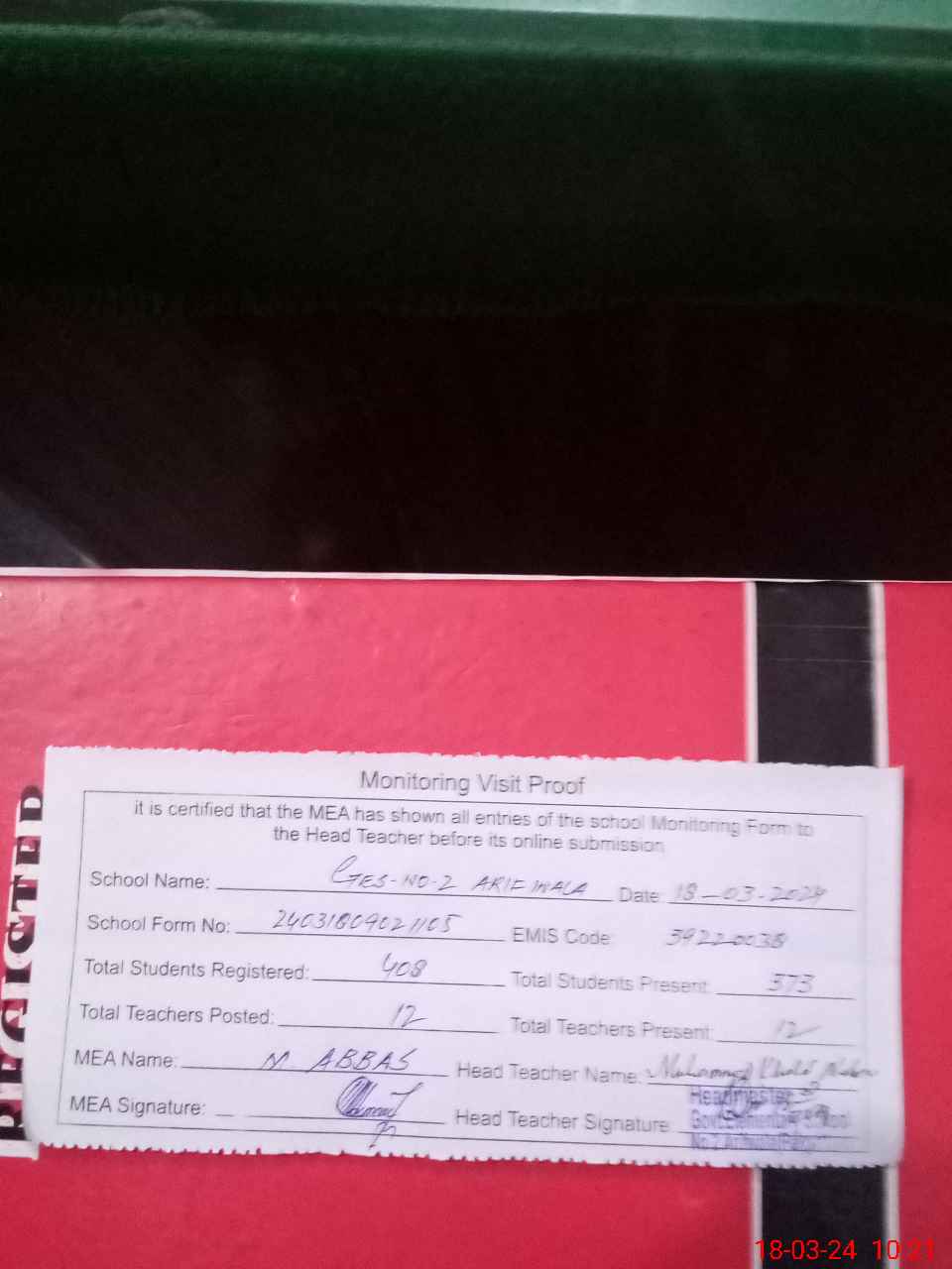 | EMIS Code: 39220038 | Name of School: GES MODEL NO. 2 D BLOCK ARIF WALA | |||