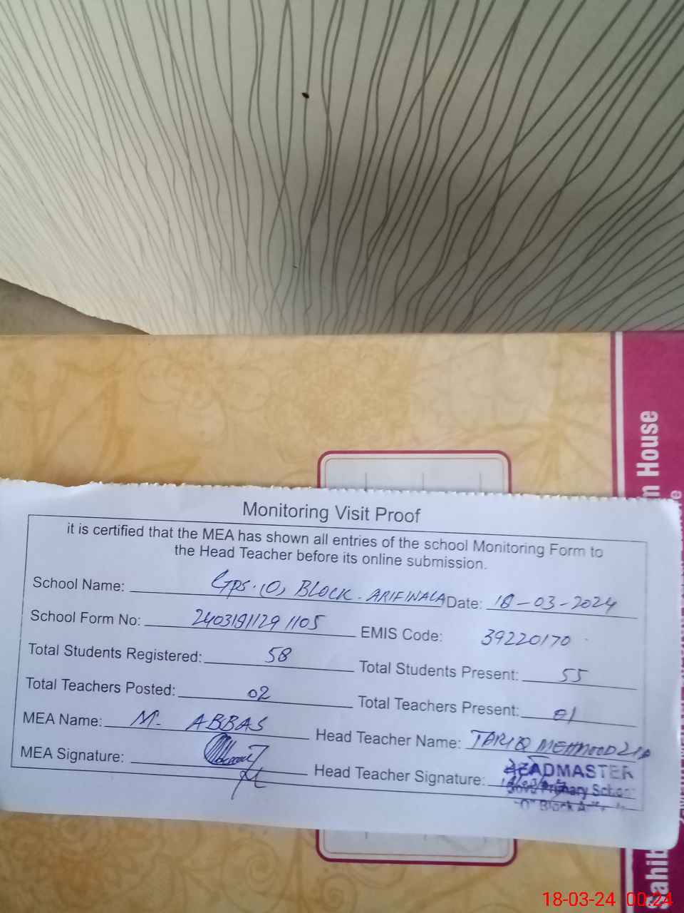 | Certified that this School was Inspected by the Undersigned MEA/DMO Today and the Information Stated Above is as Per Record. | |||||
