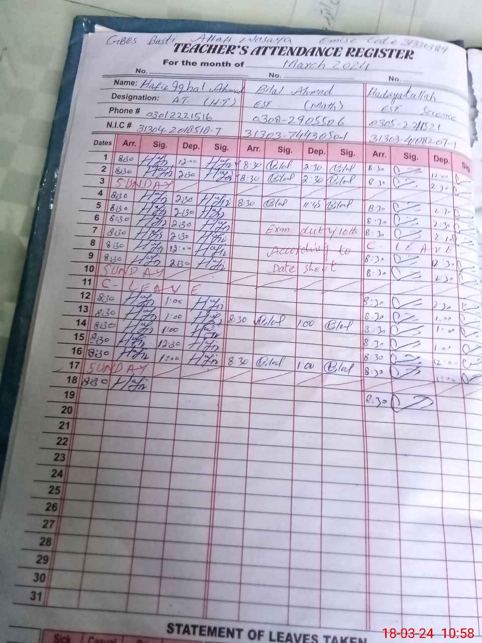 | Name: Mu**** Iq**** Designation: (School Headmaster's/Headmistress's) Sv Phone/Cell Number: 03**** |