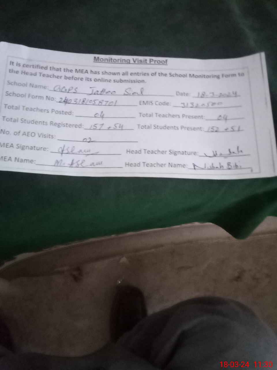 | Attendance Register | Head Teacher | MEA with School | Visit Proof |