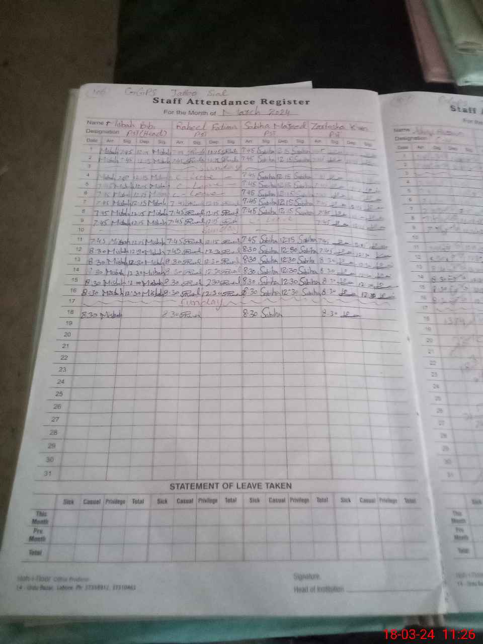 | Leave | Duty | Absent | Maternity | Medical | Ex- Pak |