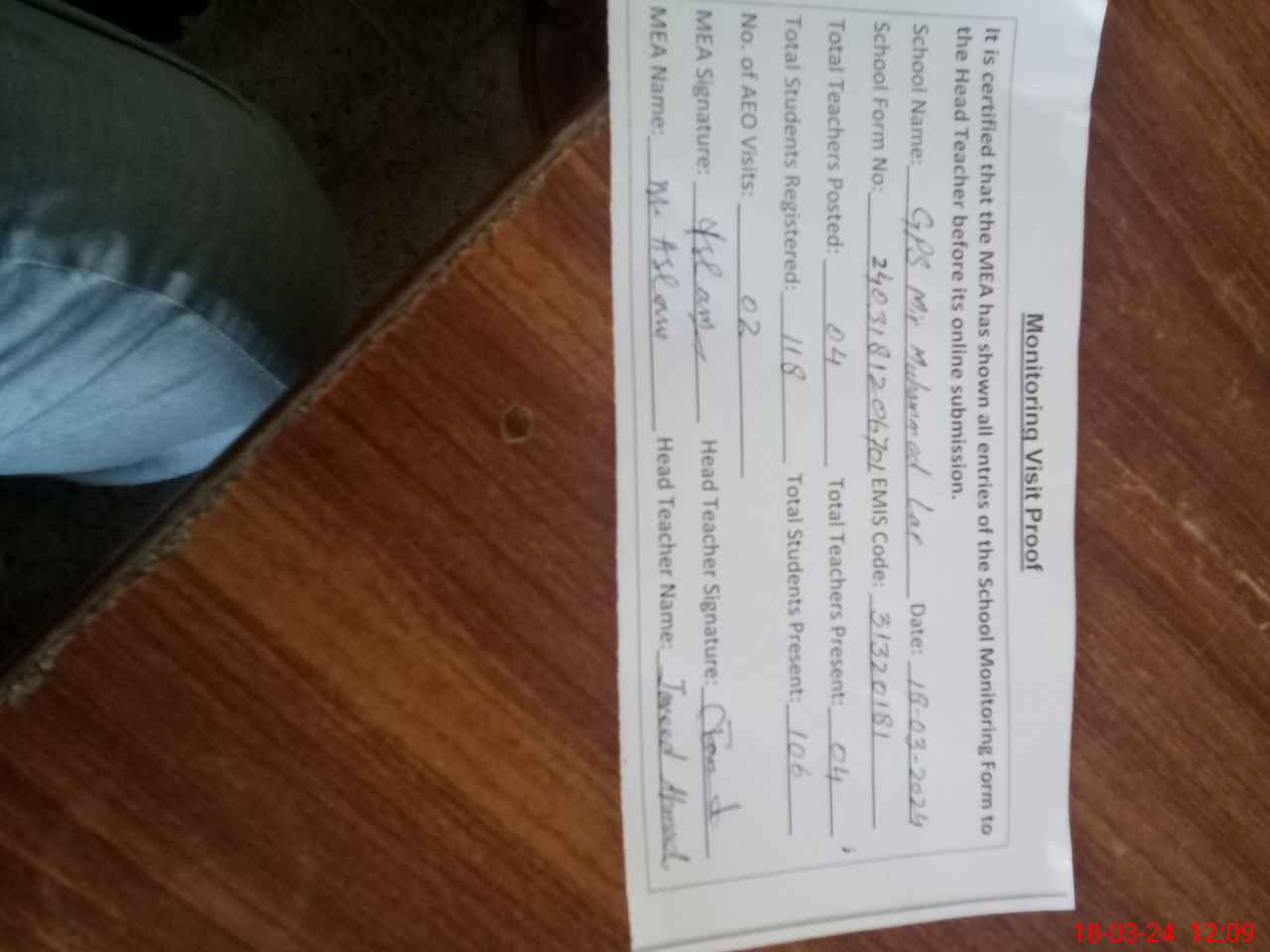 | Attendance Register | Head Teacher | MEA with School | Visit Proof |