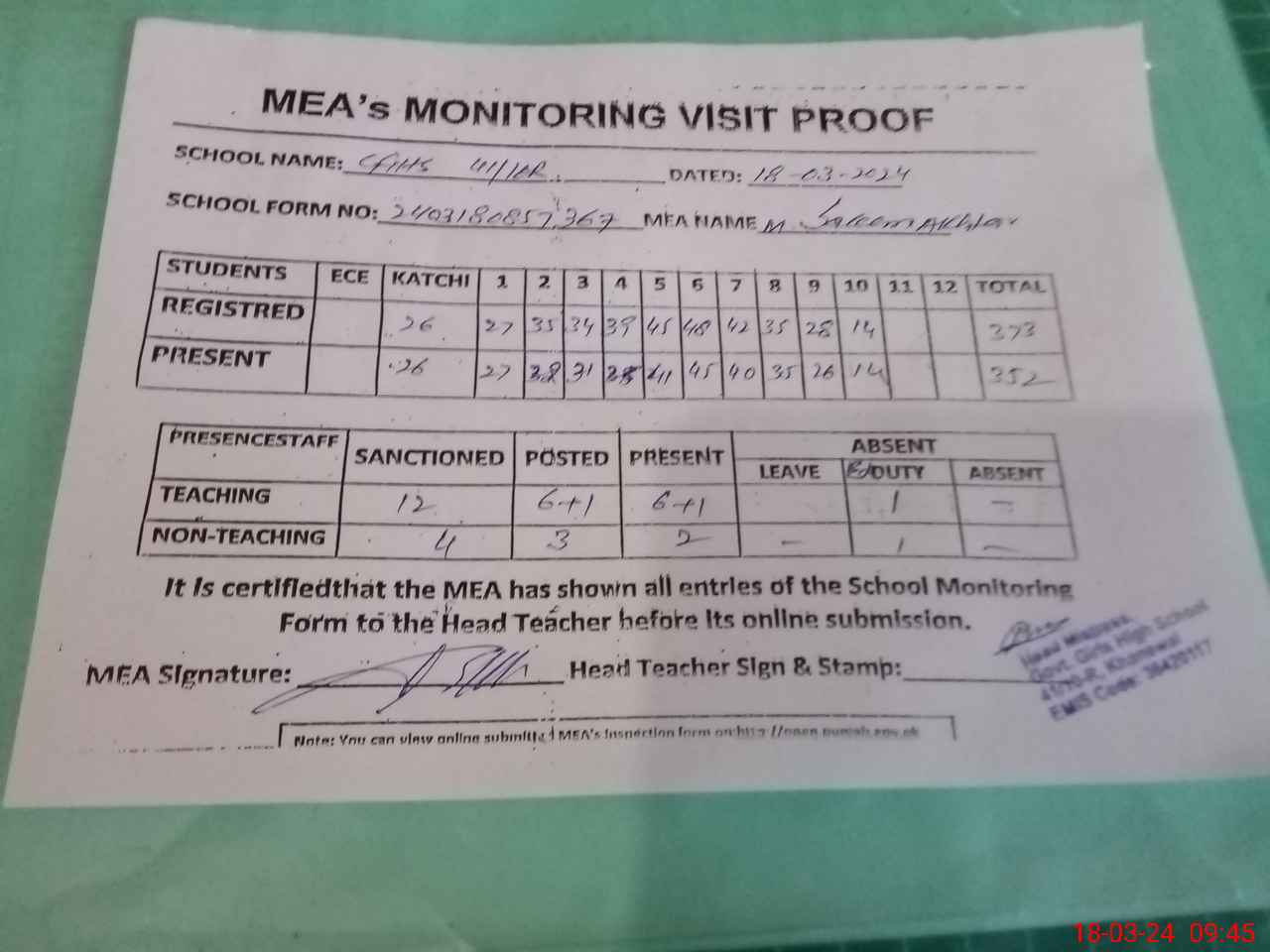 | Attendance Register | Head Teacher | MEA with School | Visit Proof |