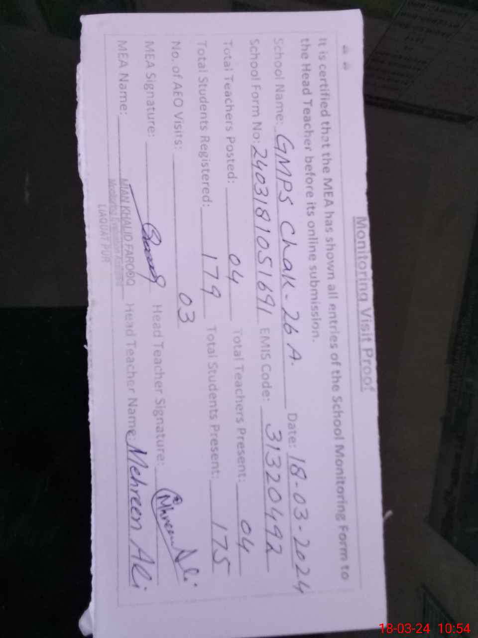 | EMIS Code: 31320492 | Name of School: GMPS CHAK NO.26/A | |||