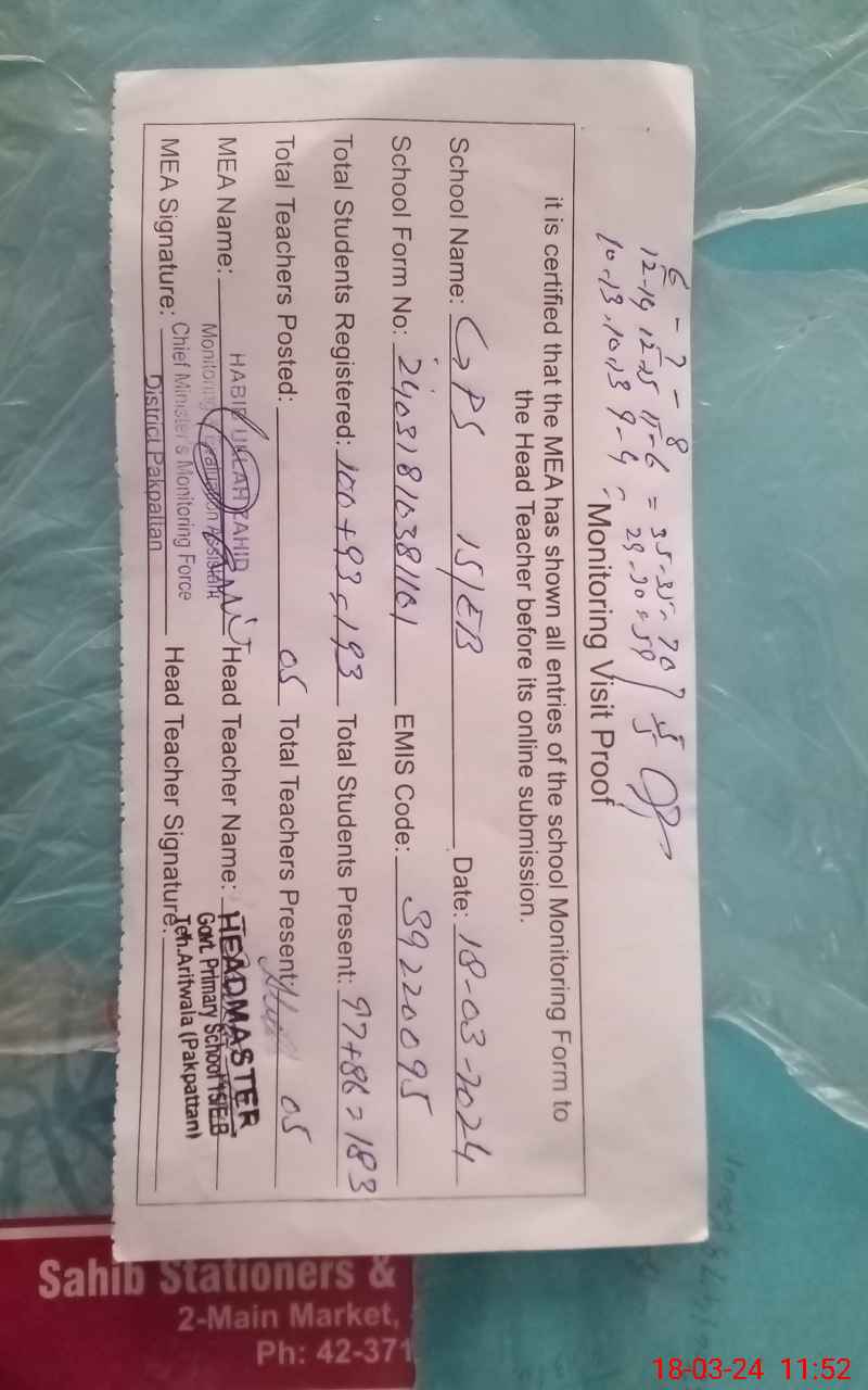| District: PAKPATTAN | Tehsil: ARIFWALA | Markaz: ARIFWALA 2 - MALE | Level: Primary | |