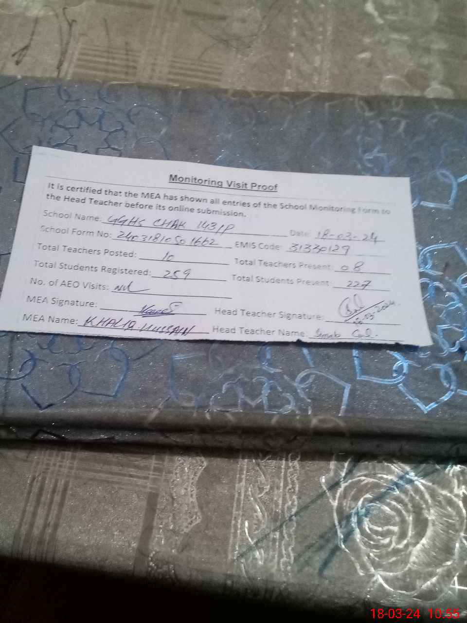 | Attendance Register | Head Teacher | MEA with School | Visit Proof |
