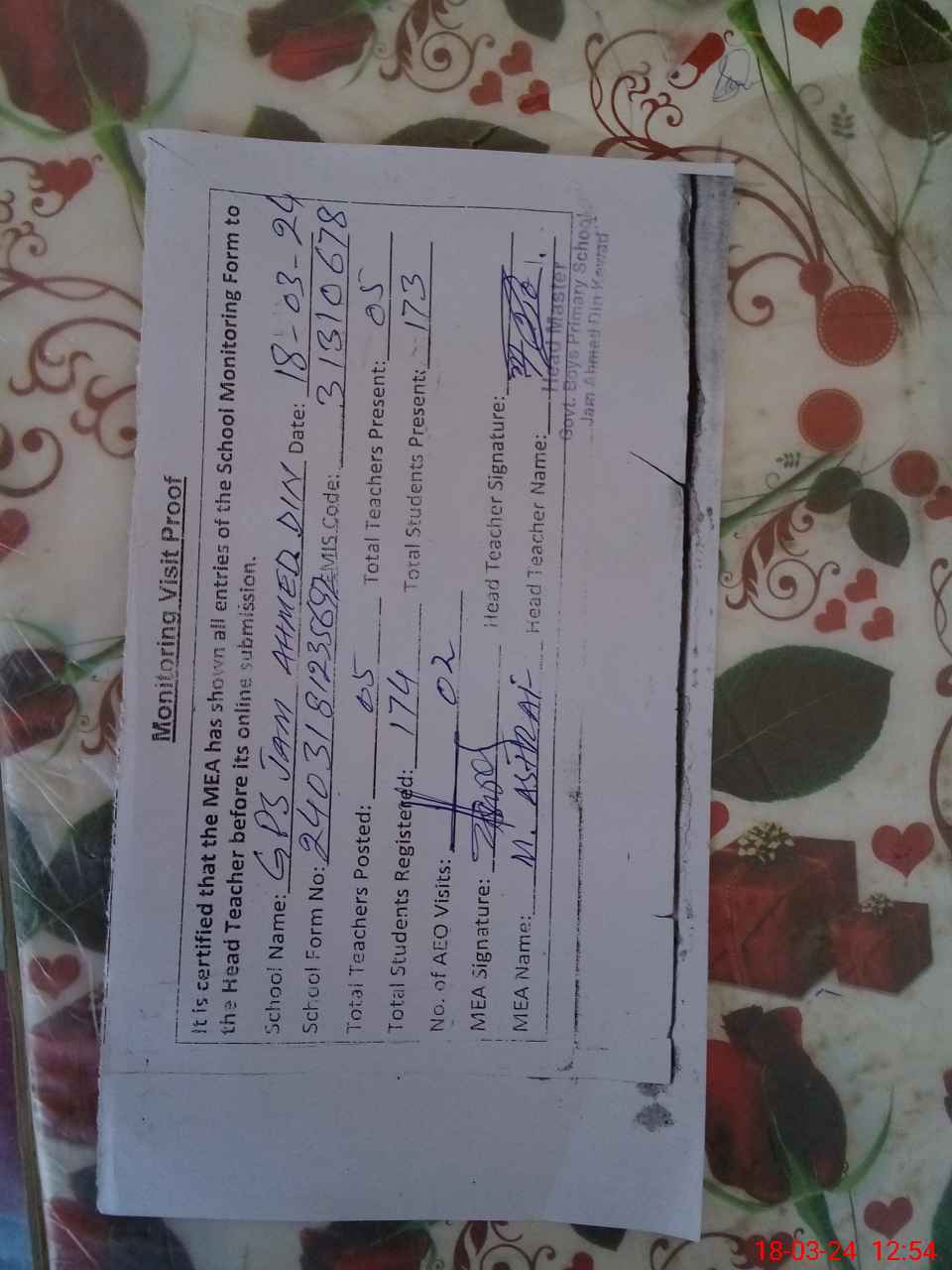 | Certified that this School was Inspected by the Undersigned MEA/DMO Today and the Information Stated Above is as Per Record. | |||||