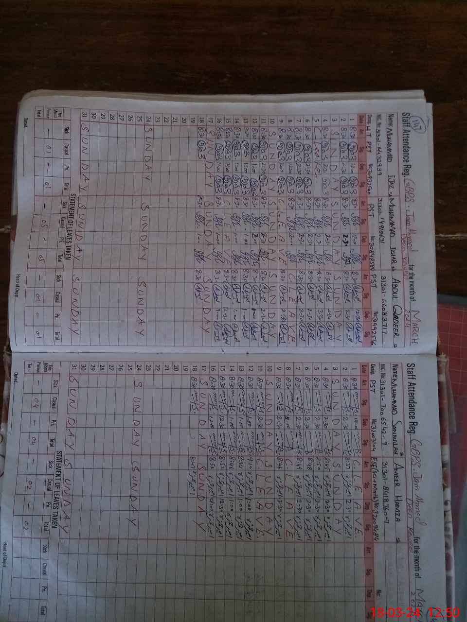 | CNIC | Full Name | Designation | R/C | Absence During Last Calender Month |