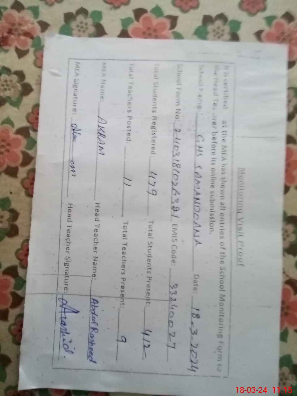 | Name: Zu**** Al**** Designation: (School Headmaster's/Headmistress's) EST. I C HEAD MASTER Phone/Cell Number: 03**** |