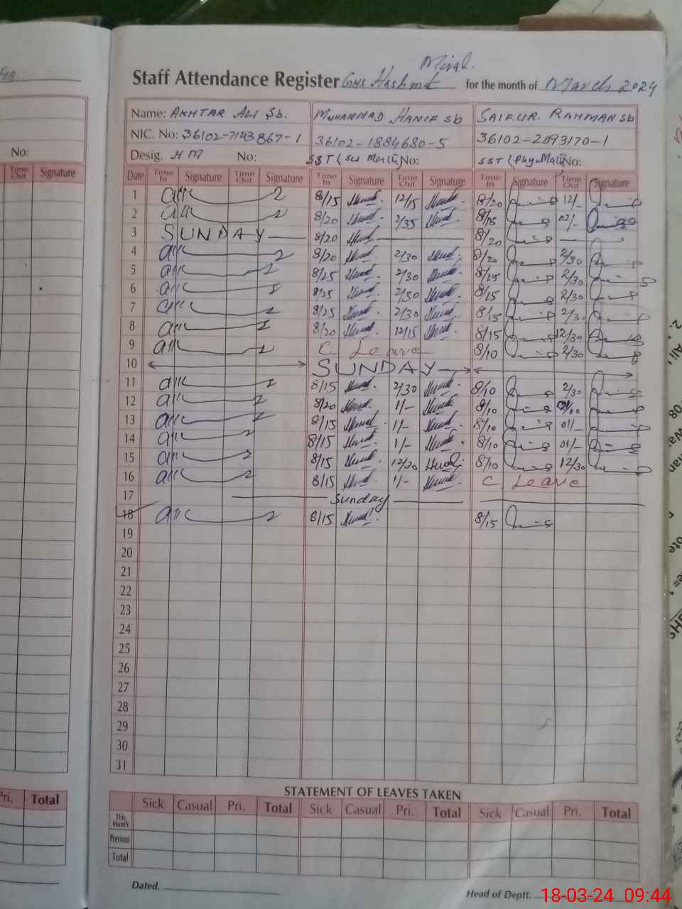| CNIC | Full Name | Designation | R/C | Absence During Last Calender Month |