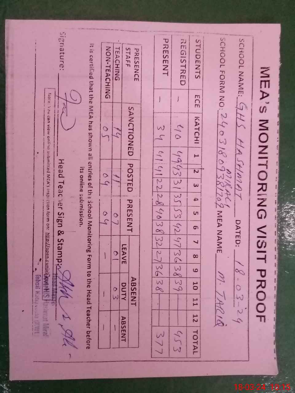 | Attendance Register | Head Teacher | MEA with School | Visit Proof |