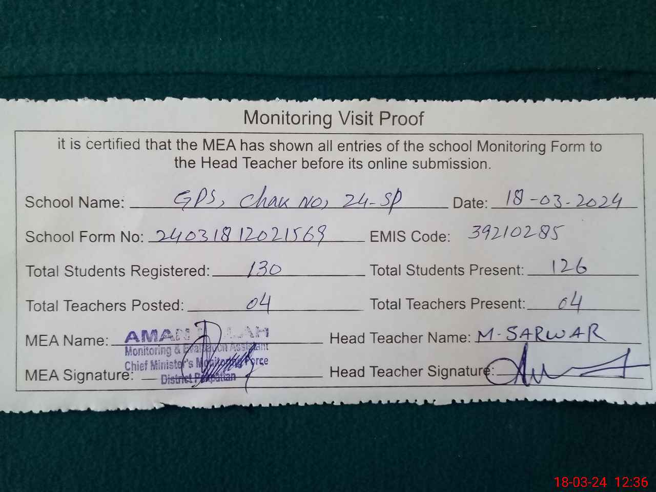 | Attendance Register | Head Teacher | MEA with School | Visit Proof |