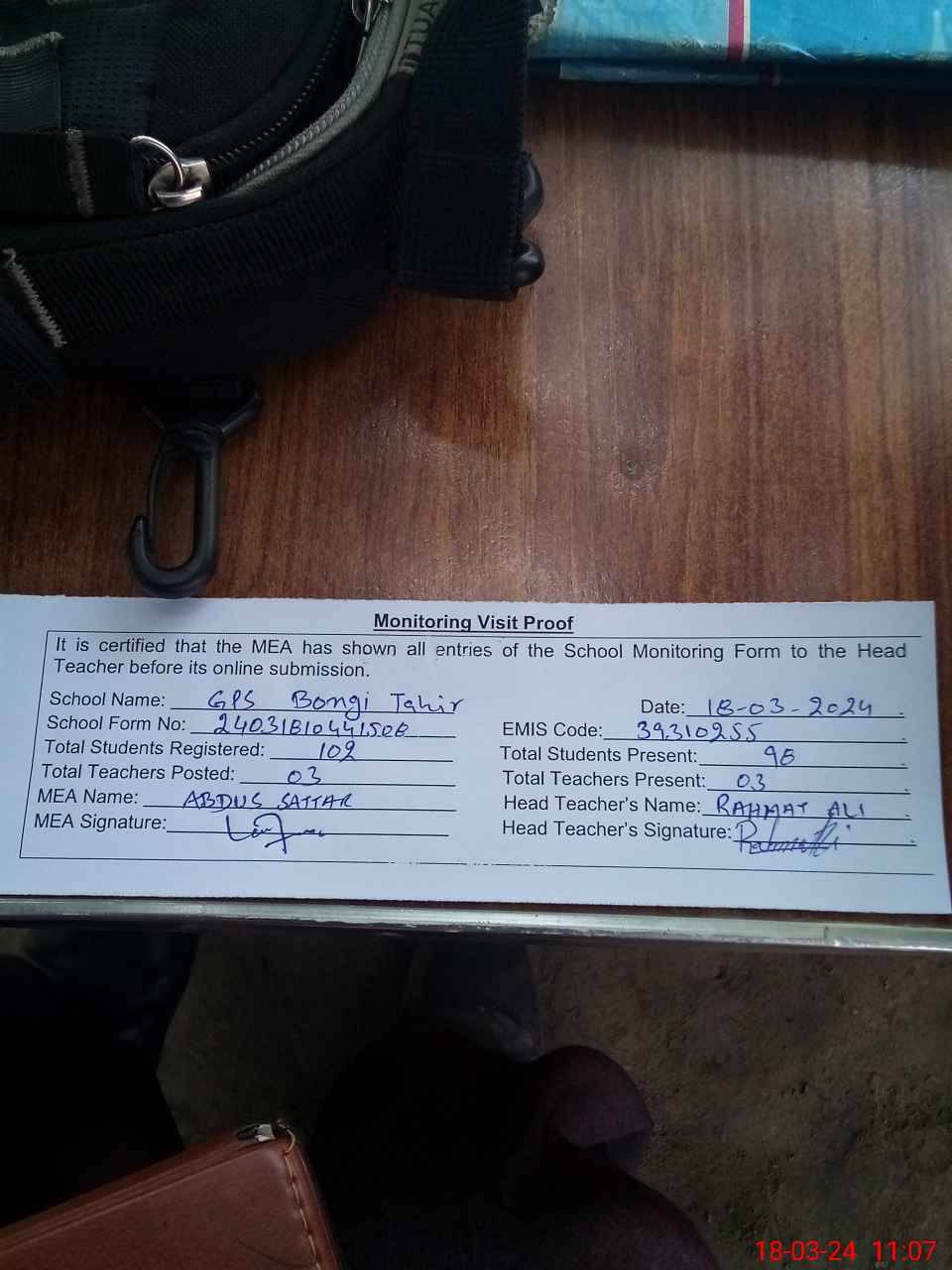 | Attendance Register | Head Teacher | MEA with School | Visit Proof |