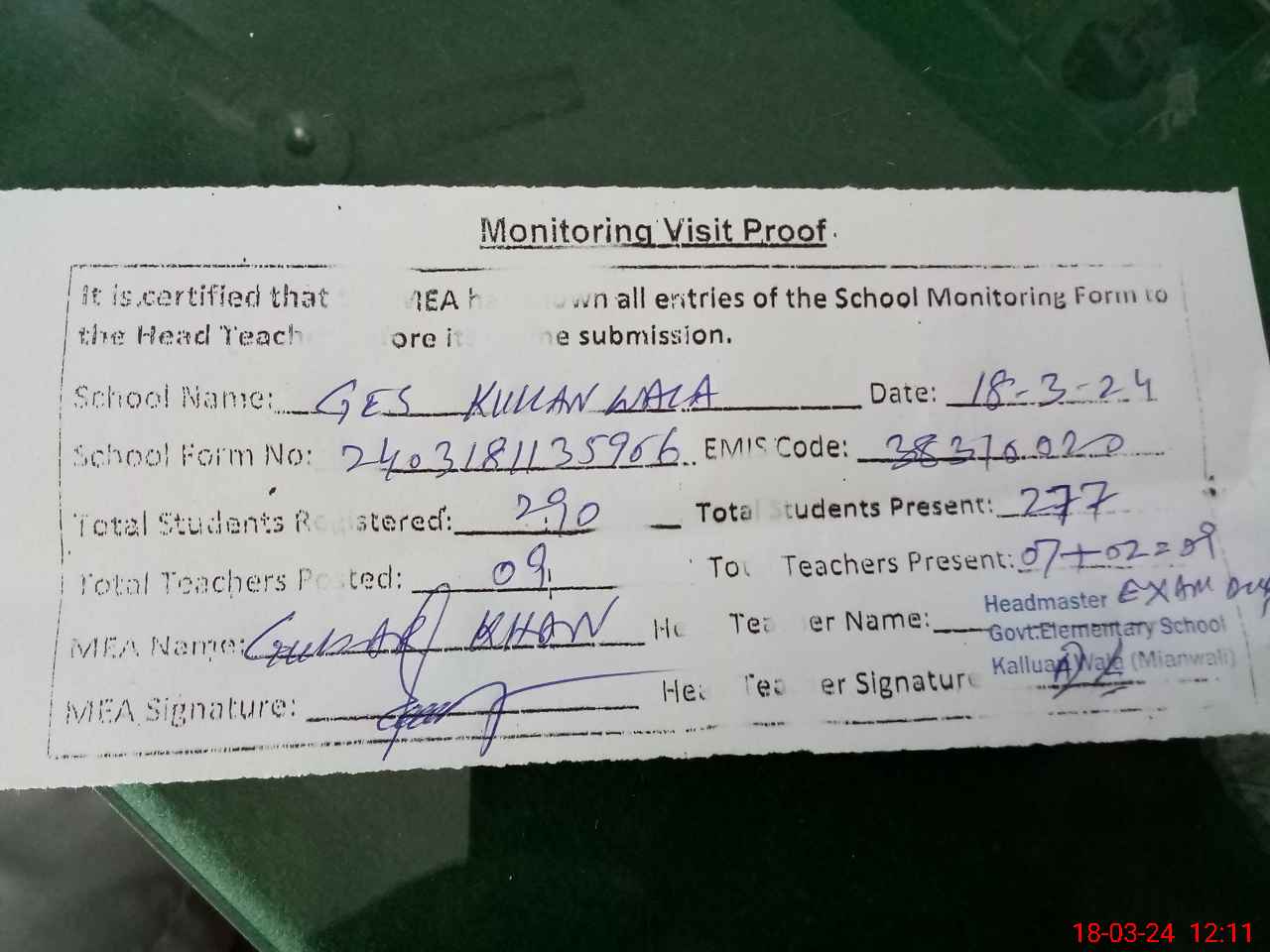 | Attendance Register | Head Teacher | MEA with School | Visit Proof |