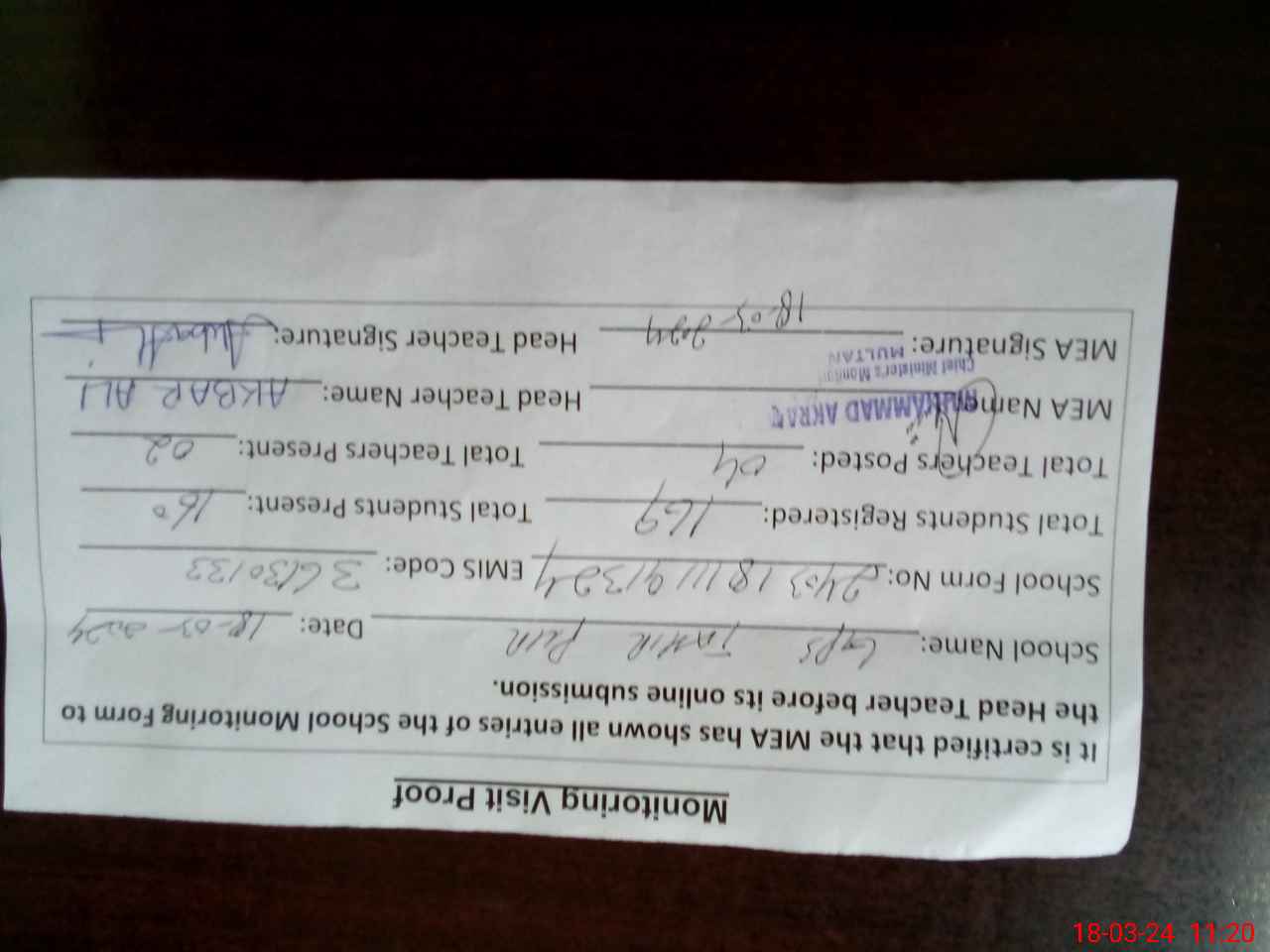 | Attendance Register | Head Teacher | MEA with School | Visit Proof |